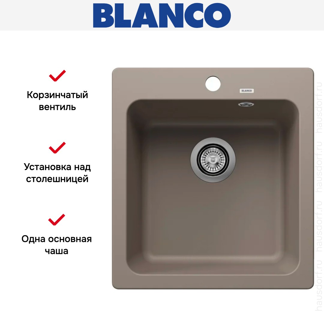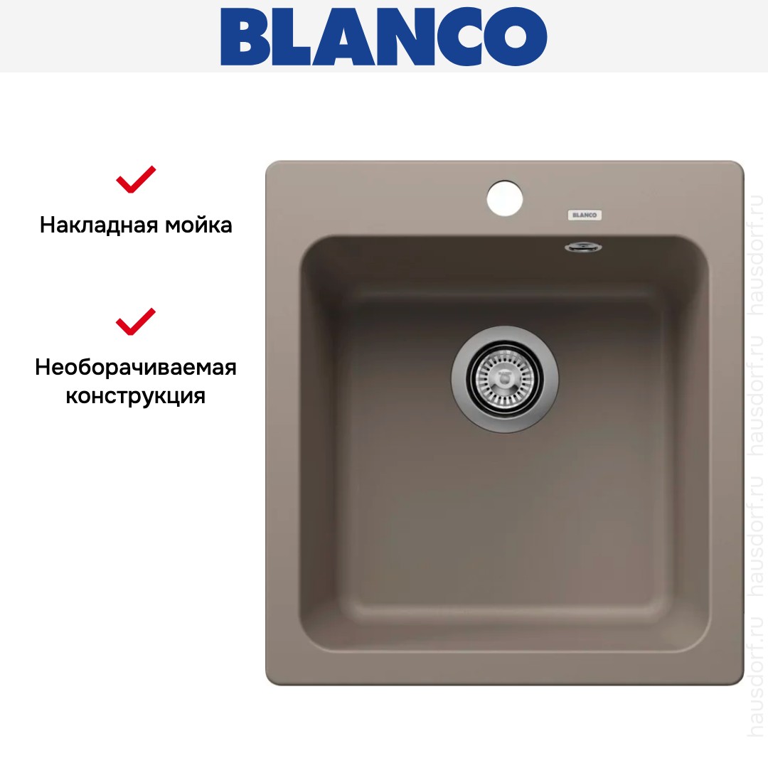 Накладная мойка Blanco — отличный выбор для тех, кто хочет создать гармоничное пространство с удобной сантехникой. простой в установке. Преимущество такой конструкции: легко подобрать практически к любой кухне и не придется демонтировать вместе с тумбой при ремонте или перестановке остальной мебели. Данная модель имеет стандартную форму, поэтому подходит большинству пользователей. Устанавливается над столешницей: это самый простой способ монтажа, зачастую с ним можно справиться даже без специалистов, главное — правильно рассчитать размеры ниши.