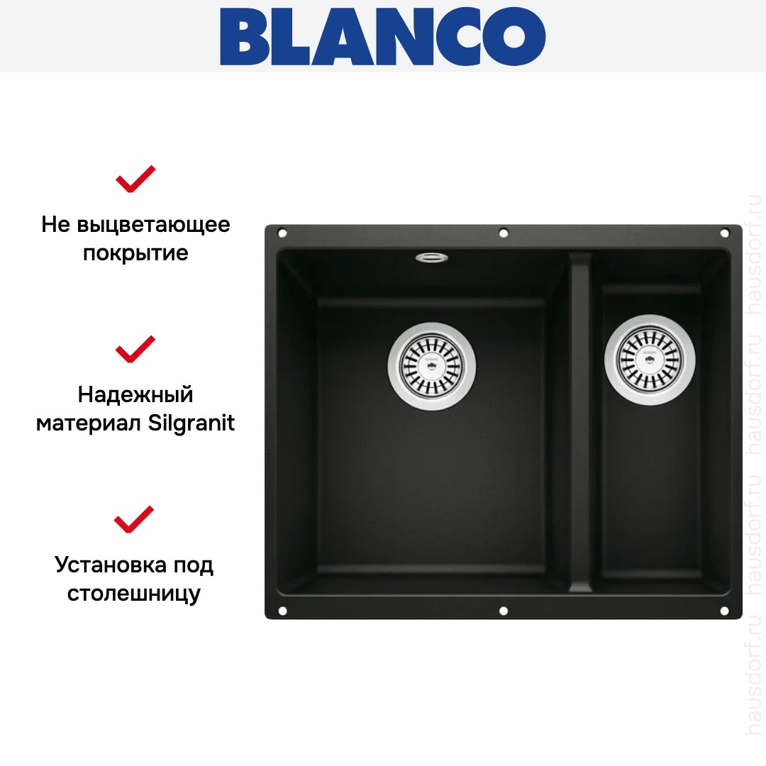 Мойка Blanco Rotan 340/160 U Silgranit черный — стильное решение для тех, кто ценит строгие формы и практичность на кухне. Она выполнена в лаконичном прямоугольном силуэте, который легко вписывается в современные гарнитуры. Подстольный монтаж создает плавный переход от столешницы к рабочей зоне и делает поверхность визуально цельной. Черный цвет добавляет глубины интерьеру и выгодно сочетается с металлом, деревом и светлыми фасадами.
