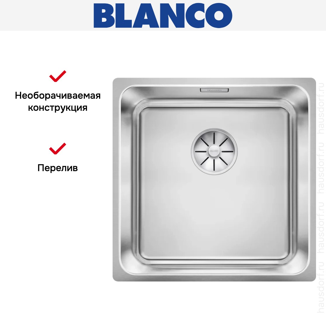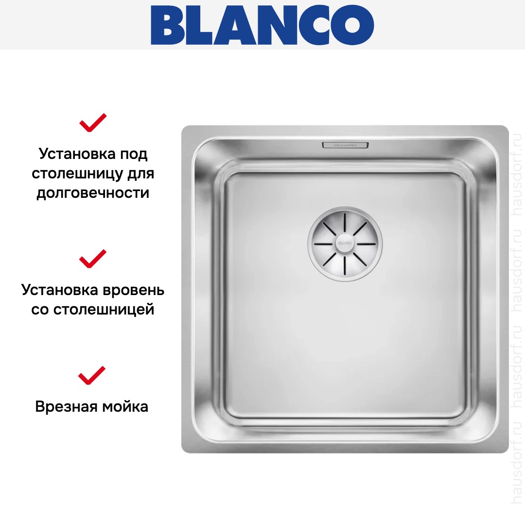Обратите внимание на дизайнерские отличия мойки Бланко, которые помогут в создании идеальной кухни в вашем доме. Она выполнена в цвете нержавеющая сталь. Основной материал — нержавеющая сталь, он гарантирует надежность и долгие годы службы без повреждений. У этого покрытия приятная матовая текстура.