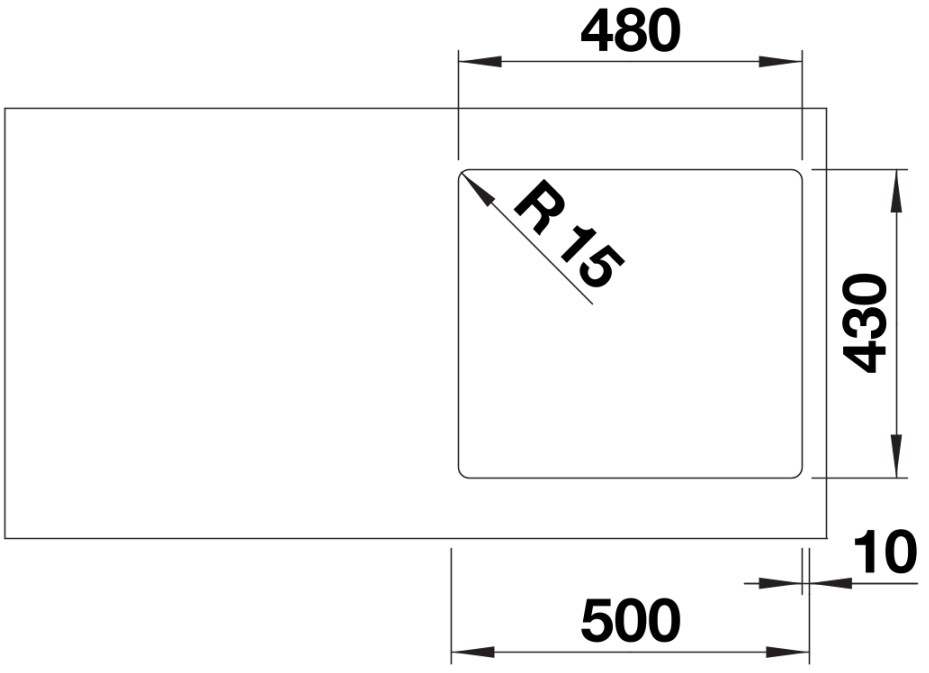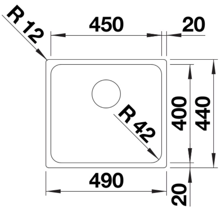 Одна основная чаша размером 45×40 см и глубиной 18,5 см обеспечивает удобство мытья кастрюль и большой посуды. Радиус скругления чаши 4,2 см облегчает очистку и уменьшает скопление грязи в углах. Малый радиус по краям 1,2 см делает профиль более четким и современным, а радиус шаблона 1,5 см гарантирует точное соответствие выреза. Такая конфигурация сочетает вместительность и комфорт использования в компактном пространстве.