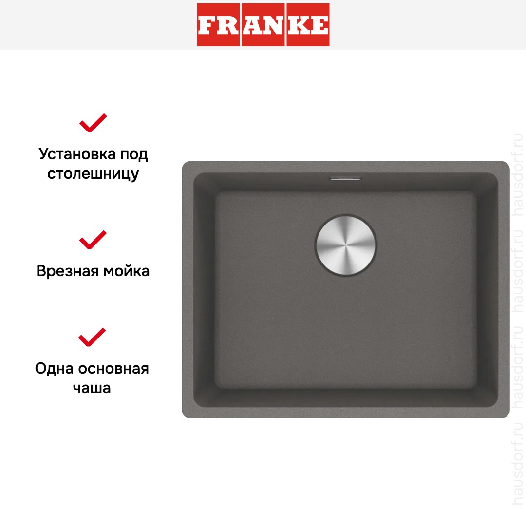 Мойка Franke MRG 110-52 каменно-серого цвета — это сбалансированное сочетание функциональности, надёжности и сдержанной эстетики для современной кухни. Эта прямоугольная врезная модель устанавливается под столешницу, создавая плавный и цельный переход от рабочей поверхности к краю чаши, что не только улучшает визуальное восприятие, но и упрощает уход за зоной стыка. Её габариты — 55,3 × 43,3 см — идеально соответствуют стандартному нижнему модулю шириной 60 см, а для установки требуется проём размером 52 × 40 см.
