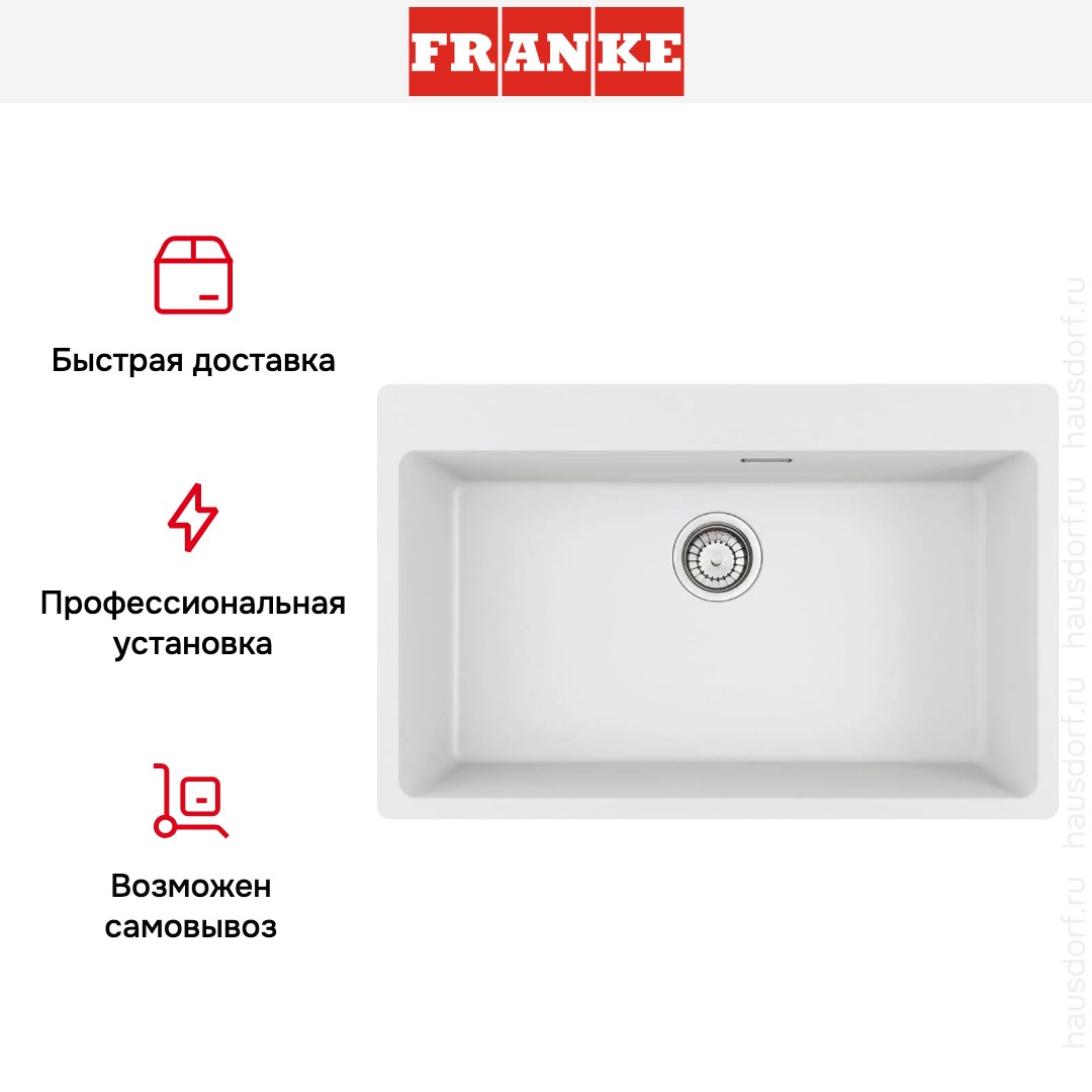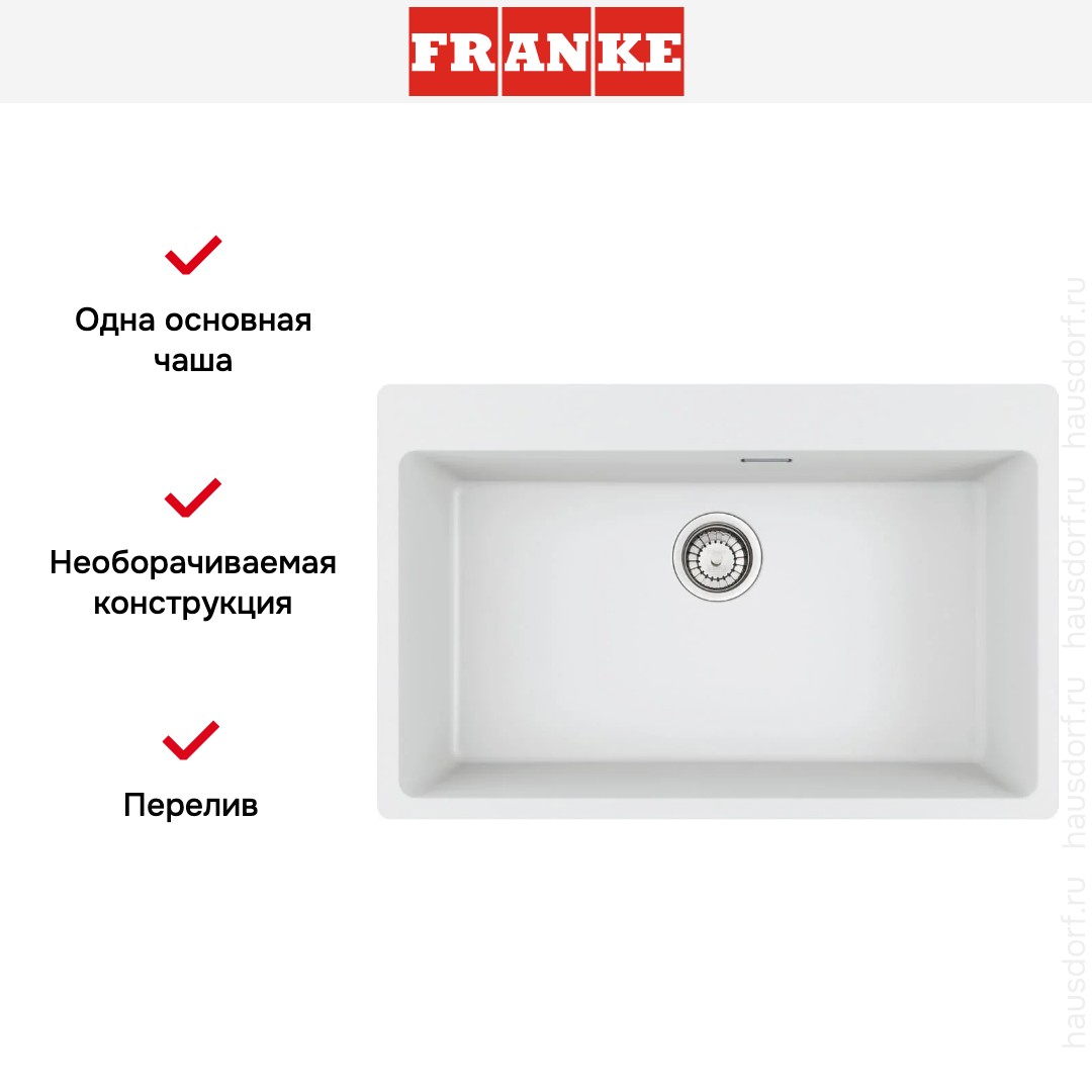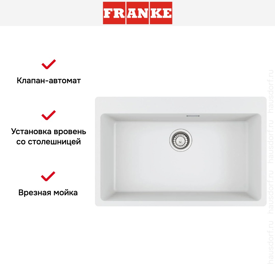 Мойка Franke MRG 610 73 белый — врезная прямоугольная модель, выполненная в светлом оттенке для сдержанного и современного интерьера. Она устанавливается вровень со столешницей, создавая ровную поверхность и минималистичный силуэт. Такой подход к монтажу визуально расширяет рабочую зону и облегчает уборку, ведь крошки и вода легко смахиваются прямо в чашу.