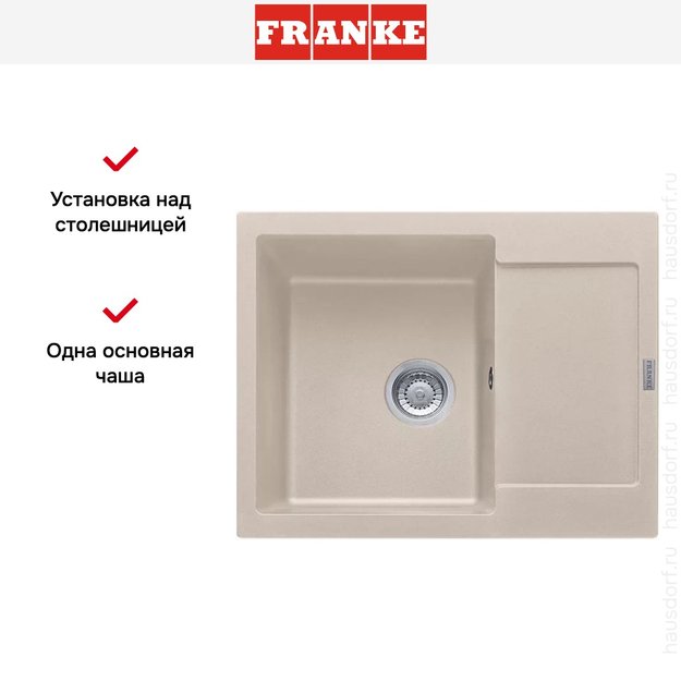 Накладная мойка Franke — отличный выбор для тех, кто хочет создать гармоничное пространство с удобной сантехникой. простой в установке. Преимущество такой конструкции: легко подобрать практически к любой кухне и не придется демонтировать вместе с тумбой при ремонте или перестановке остальной мебели. Данная модель имеет стандартную форму, поэтому подходит большинству пользователей. Устанавливается над столешницей: это самый простой способ монтажа, зачастую с ним можно справиться даже без специалистов, главное — правильно рассчитать размеры ниши.