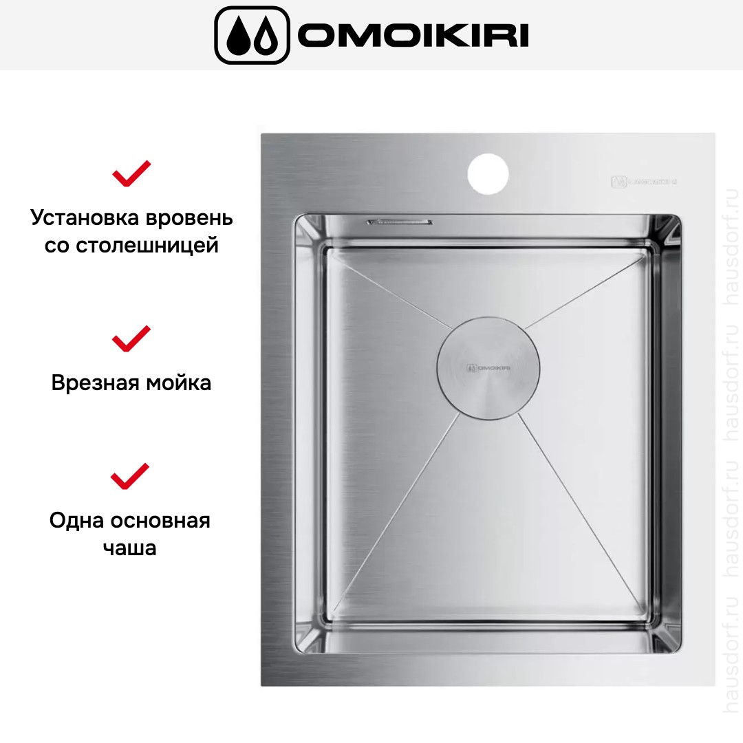 Врезная мойка Omoikiri — отличный выбор для тех, кто хочет создать гармоничное кухонное пространство с полностью вписывающейся в него сантехникой. Преимущество такой конструкции — плотное прилегание к столешнице, так как вырез подбирается индивидуально под габариты модели. Под стыки не попадает вода, поэтому срок службы значительно увеличивается, пользоваться ей удобно и приятно. Данная модель имеет стандартную форму, поэтому подходит большинству пользователей. Устанавливается вровень со столешницей, благодаря чему не остается стыков, в которых копились бы загрязнения.