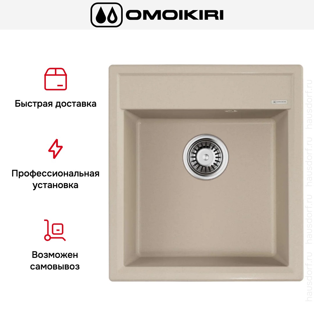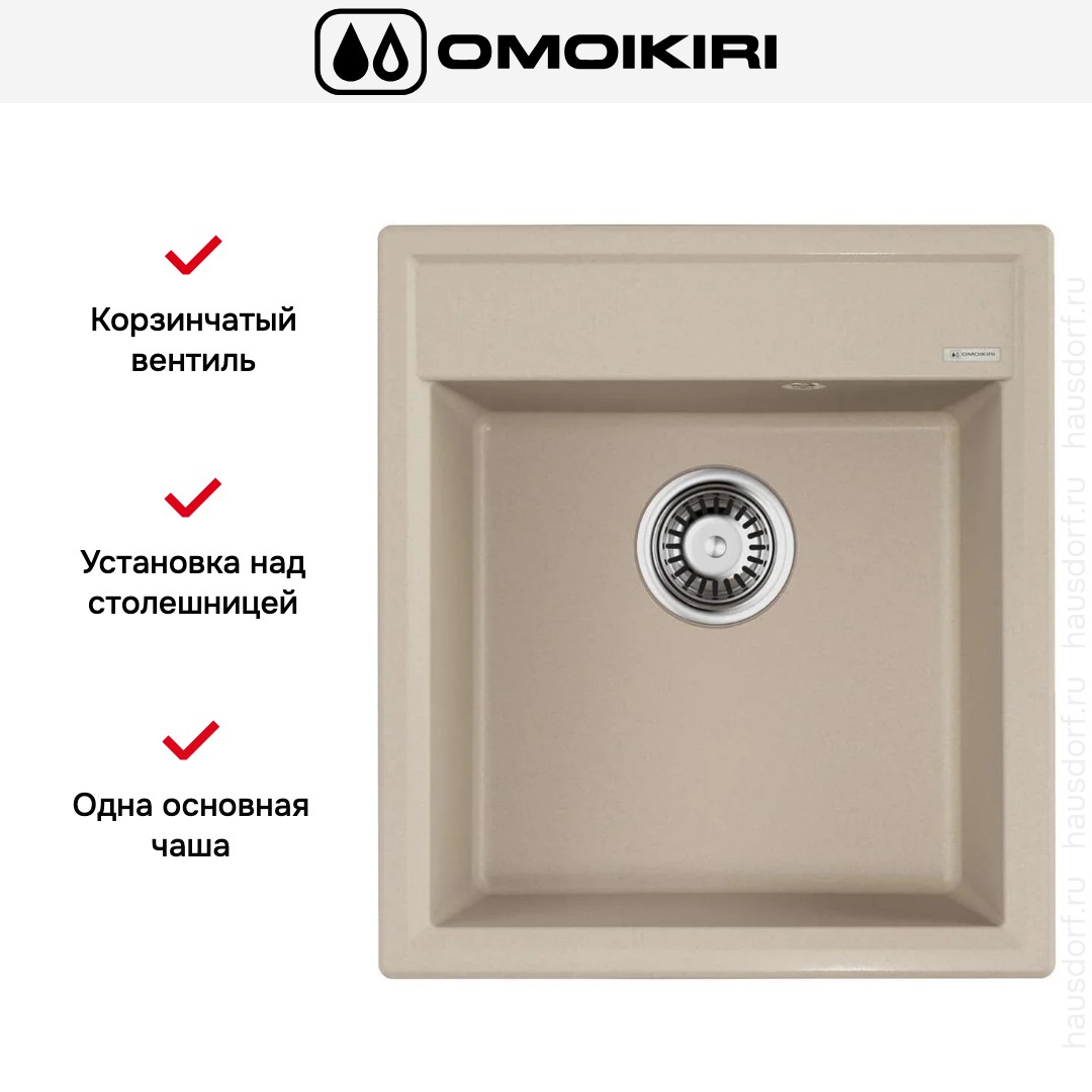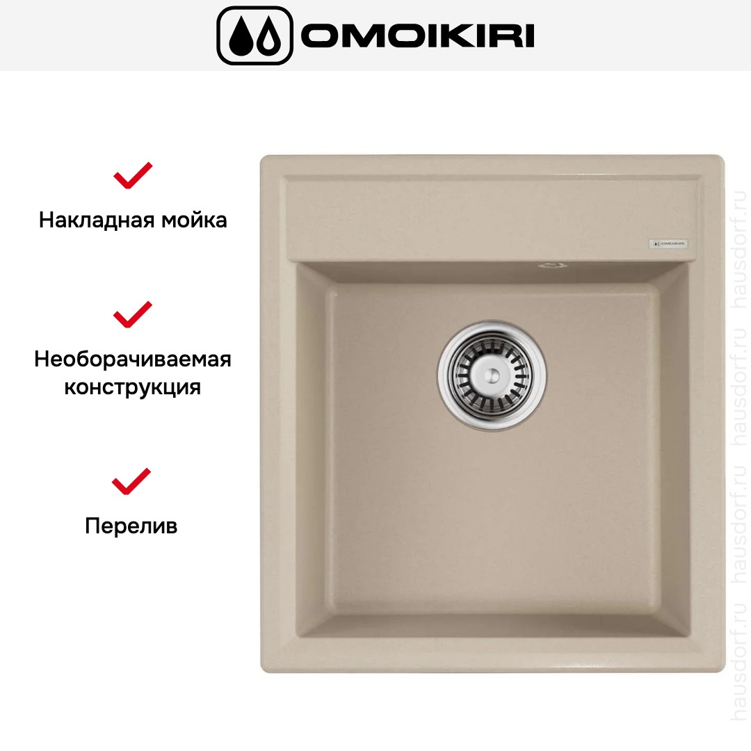 Мойка Omoikiri Daisen 46-SA — накладная, квадратная и компактная раковина с габаритами 46×51 см, выполненная в теплой бежевой палитре. Изделие изготовлено методом литья из материала ArtGranit толщиной 10 мм, что придает поверхности однородную текстуру и приятный матовый вид. Классическая форма без лишних изгибов делает модель универсальной для современных и традиционных интерьеров. Плоская окантовка и аккуратные геометрические линии выгодно смотрятся как на светлой, так и на темной столешнице.