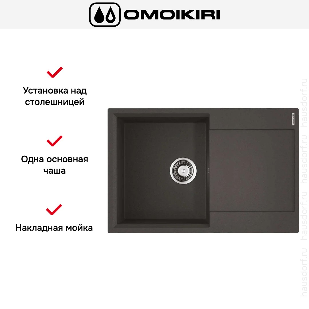 Мойка OMOIKIRI DAISEN 78 BL — накладная прямоугольная модель шириной 78 см и глубиной 51 см, созданная для практичных кухонных решений. Габариты 78×51 см и способ установки над столешницей делают её универсальным выбором при ремонте или замене. Ширина базы 50 см и монтажное отверстие 76×49 см упрощают подбор тумбы и точное встраивание в рабочую поверхность.