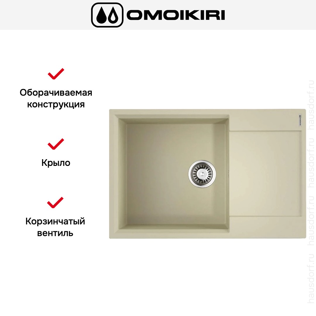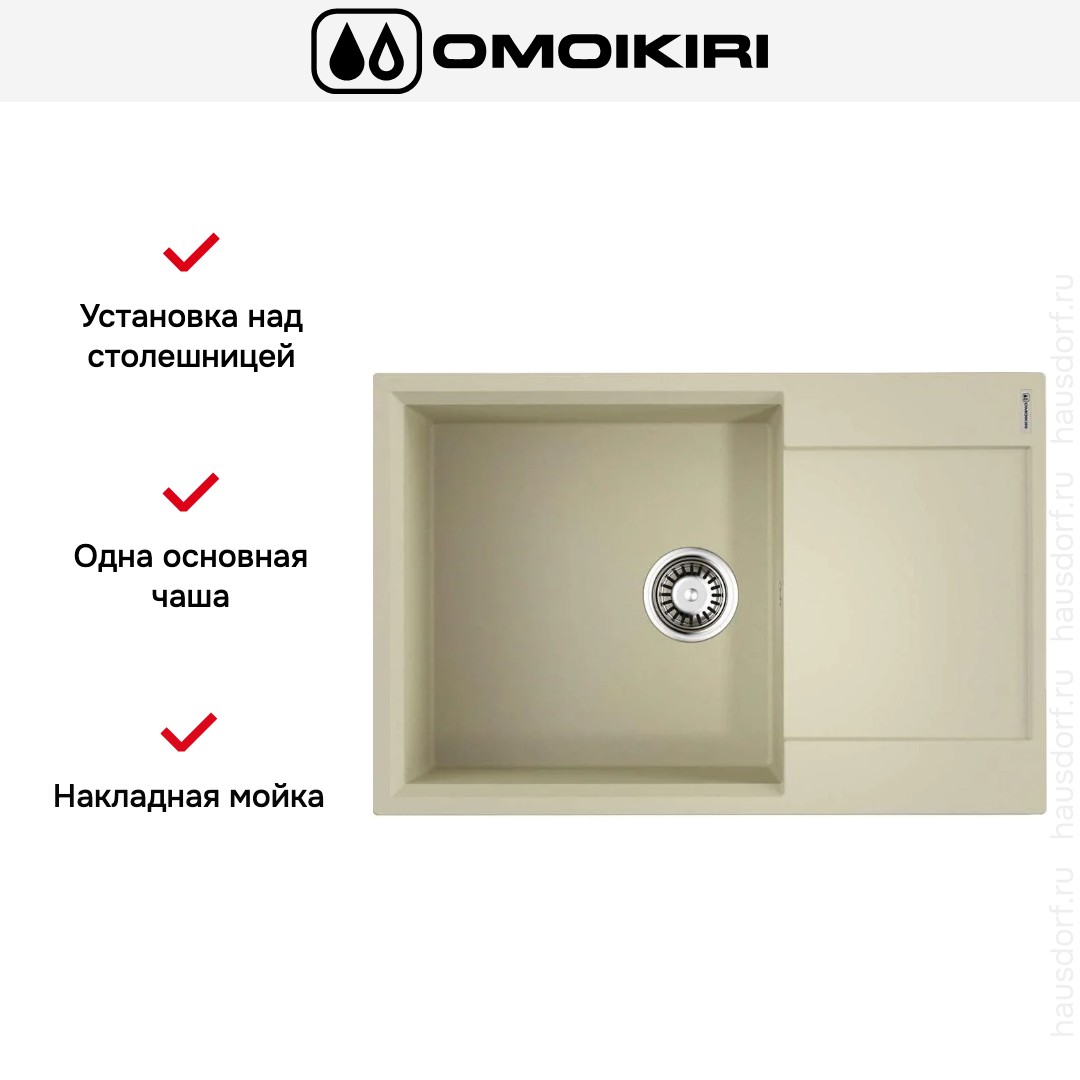 Мойка OMOIKIRI Daisen 78-LB BE — накладная модель, сочетающая лаконичный прямоугольный дизайн и практичную конструкцию. Она станет идеальным выбором для современной кухни. Компактные габариты 7851 см позволяют установить изделие на стандартную тумбу 60 см, а универсальная ориентация с возможностью установки крыла слева или справа дает возможность гибко планировать рабочую зону. Большая основная чаша размером 4444 см и глубиной 19 см обеспечивает удобство мытья даже крупных предметов — например, кастрюль внушительного объема. Наличие перелива исключает затопление и гарантирует безопасность при использовании мойки. Мягкий цвет «ваниль» придает уют и теплоту интерьеру.