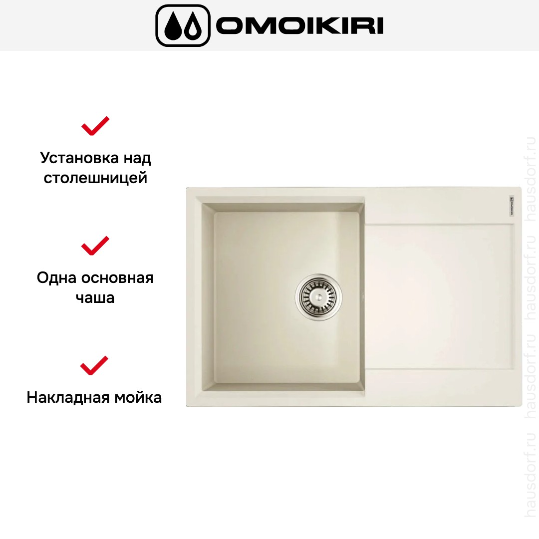 Накладная мойка Omoikiri — отличный выбор для тех, кто хочет создать гармоничное пространство с удобной сантехникой. простой в установке. Преимущество такой конструкции: легко подобрать практически к любой кухне и не придется демонтировать вместе с тумбой при ремонте или перестановке остальной мебели. Данная модель имеет стандартную форму, поэтому подходит большинству пользователей. Устанавливается над столешницей: это самый простой способ монтажа, зачастую с ним можно справиться даже без специалистов, главное — правильно рассчитать размеры ниши.