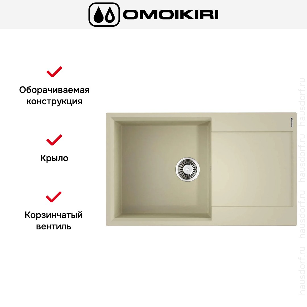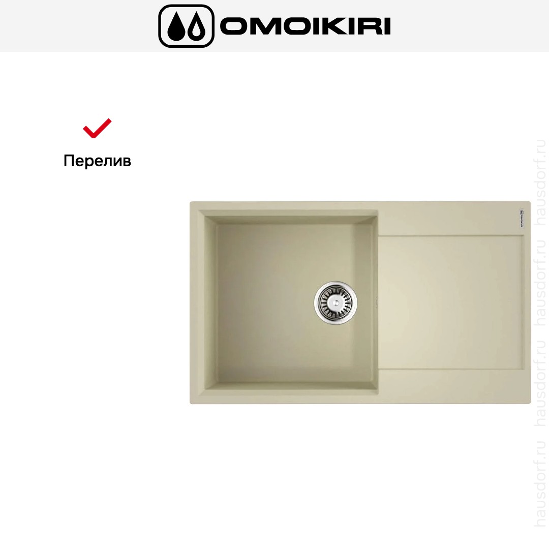 Мойка OMOIKIRI Daisen 86 BE — накладная прямоугольная модель шириной 86 см и глубиной 51 см, выполненная в мягком ванильном цвете и созданная для удобной и эстетичной эксплуатации на кухне. Ее габариты 86×51 см и монтажный вырез 84×49 см рассчитаны на установку над столешницей в базу от 60 см, что делает изделие совместимым с большинством стандартных кухонных гарнитуров.