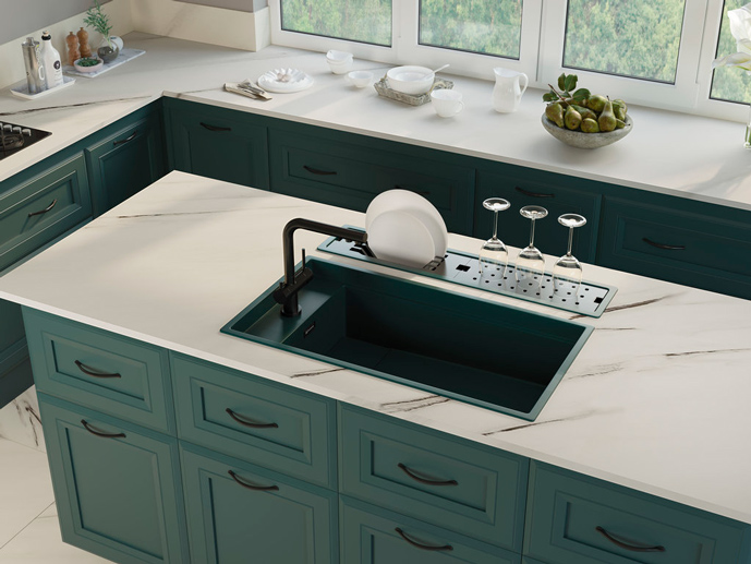 вровень со столешницей — создается ощущение бесшовного пространства, а если мойка сделана из того же материала, то и единого дизайна;
