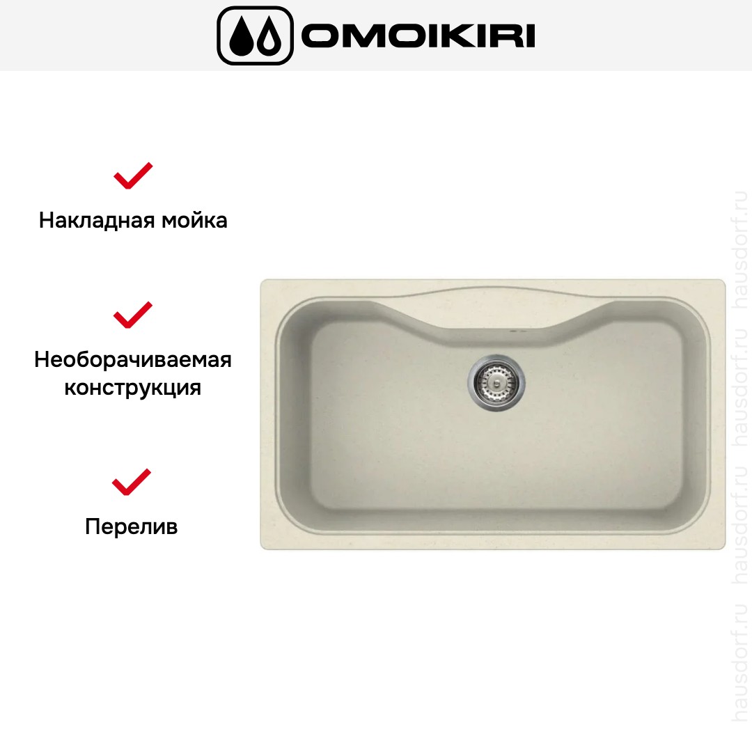 Накладная мойка Omoikiri — отличный выбор для тех, кто хочет создать гармоничное пространство с удобной сантехникой. простой в установке. Преимущество такой конструкции: легко подобрать практически к любой кухне и не придется демонтировать вместе с тумбой при ремонте или перестановке остальной мебели. Данная модель имеет стандартную форму, поэтому подходит большинству пользователей. Устанавливается над столешницей: это самый простой способ монтажа, зачастую с ним можно справиться даже без специалистов, главное — правильно рассчитать размеры ниши.