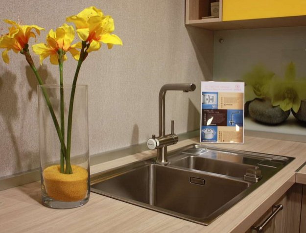 вровень со столешницей — создается ощущение бесшовного пространства, а если мойка сделана из того же материала, то и единого дизайна;
