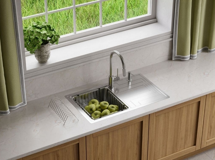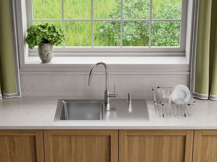 вровень со столешницей — создается ощущение бесшовного пространства, а если мойка сделана из того же материала, то и единого дизайна;