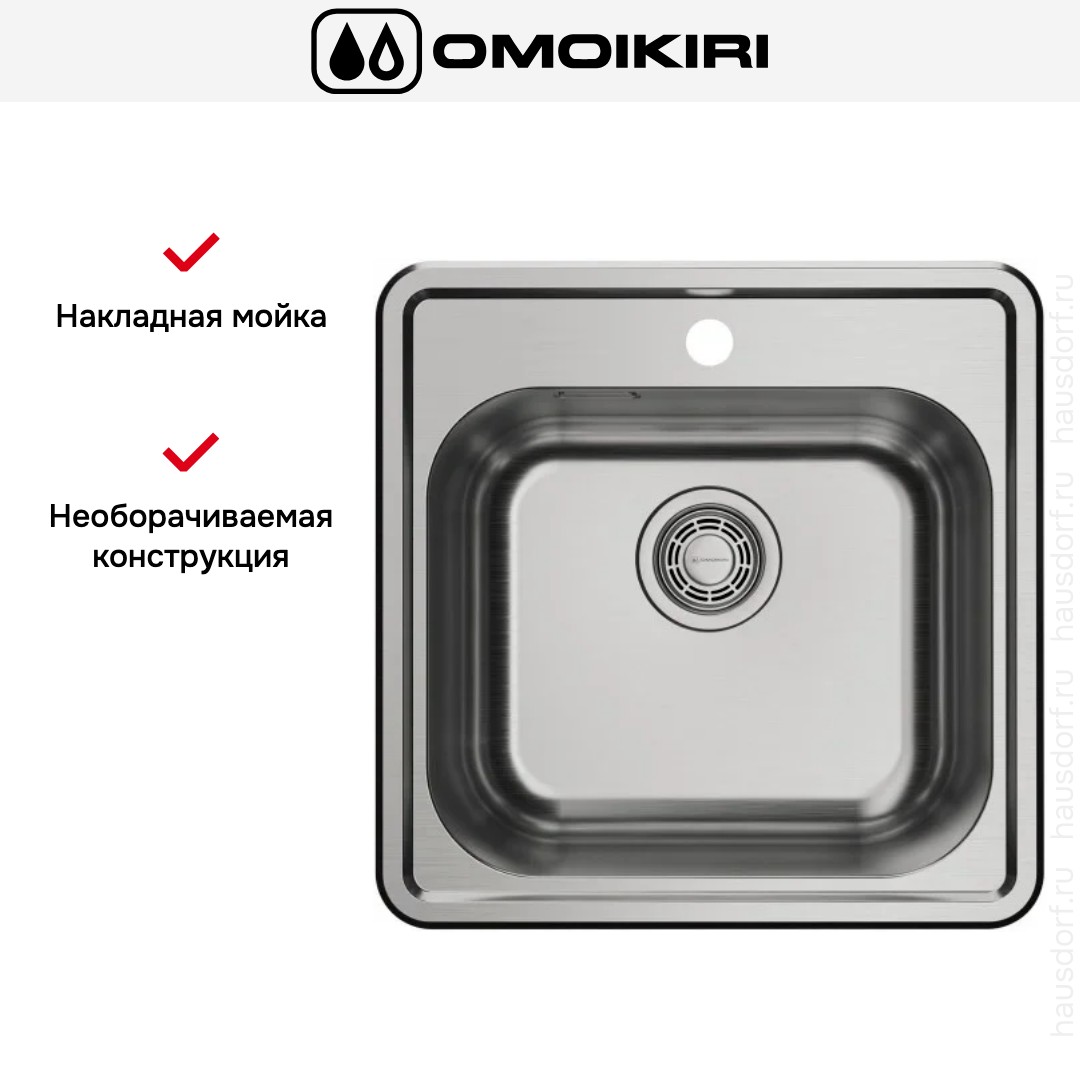 Накладная мойка Omoikiri — отличный выбор для тех, кто хочет создать гармоничное пространство с удобной сантехникой. простой в установке. Преимущество такой конструкции: легко подобрать практически к любой кухне и не придется демонтировать вместе с тумбой при ремонте или перестановке остальной мебели. Данная модель имеет стандартную форму, поэтому подходит большинству пользователей. Устанавливается над столешницей: это самый простой способ монтажа, зачастую с ним можно справиться даже без специалистов, главное — правильно рассчитать размеры ниши.