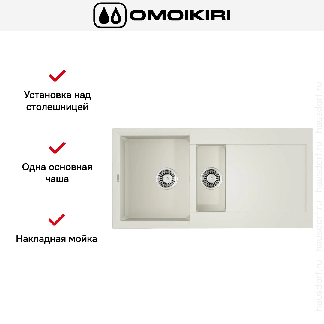 Накладная мойка Omoikiri — отличный выбор для тех, кто хочет создать гармоничное пространство с удобной сантехникой. простой в установке. Преимущество такой конструкции: легко подобрать практически к любой кухне и не придется демонтировать вместе с тумбой при ремонте или перестановке остальной мебели. Данная модель имеет стандартную форму, поэтому подходит большинству пользователей. Устанавливается над столешницей: это самый простой способ монтажа, зачастую с ним можно справиться даже без специалистов, главное — правильно рассчитать размеры ниши.