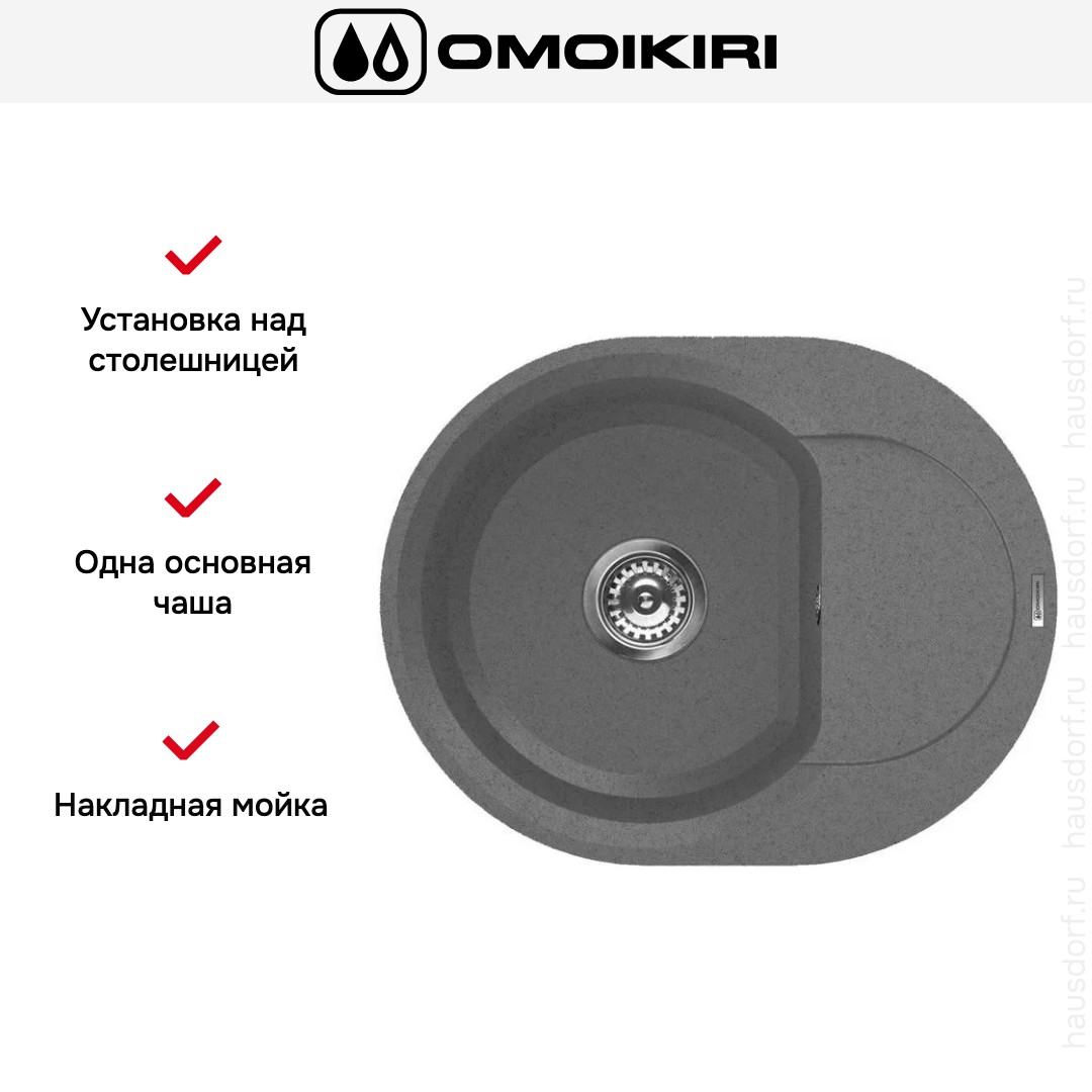 Накладная мойка Omoikiri — отличный выбор для тех, кто хочет создать гармоничное пространство с удобной сантехникой. простой в установке. Преимущество такой конструкции: легко подобрать практически к любой кухне и не придется демонтировать вместе с тумбой при ремонте или перестановке остальной мебели. Данная модель имеет скругленный контур, поэтому выбор тумбочки для нее потребует дополнительного внимания. Устанавливается над столешницей: это самый простой способ монтажа, зачастую с ним можно справиться даже без специалистов, главное — правильно рассчитать размеры ниши.