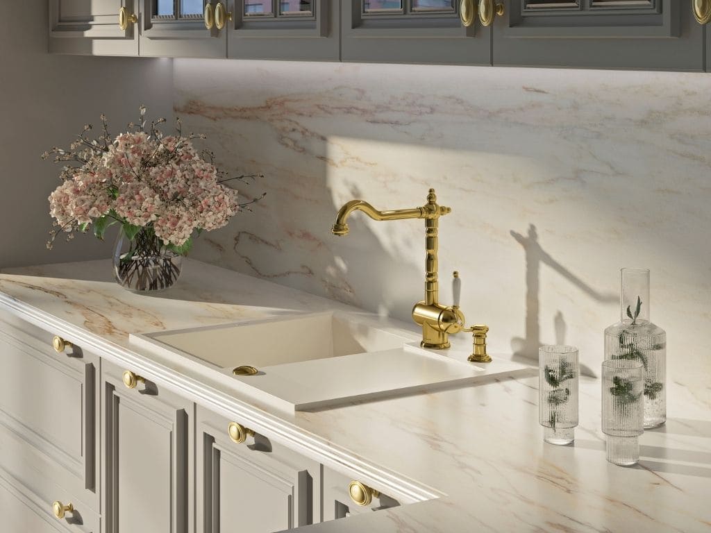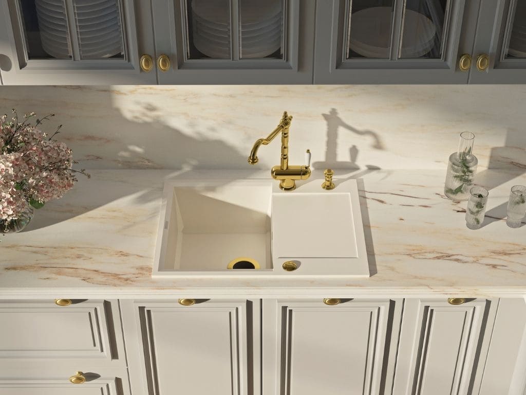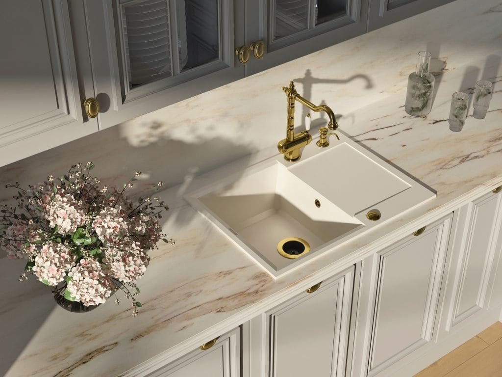 вровень со столешницей — создается ощущение бесшовного пространства, а если мойка сделана из того же материала, то и единого дизайна;