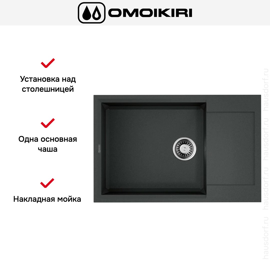 Накладная мойка Omoikiri — отличный выбор для тех, кто хочет создать гармоничное пространство с удобной сантехникой. простой в установке. Преимущество такой конструкции: легко подобрать практически к любой кухне и не придется демонтировать вместе с тумбой при ремонте или перестановке остальной мебели. Данная модель имеет стандартную форму, поэтому подходит большинству пользователей. Устанавливается над столешницей: это самый простой способ монтажа, зачастую с ним можно справиться даже без специалистов, главное — правильно рассчитать размеры ниши.