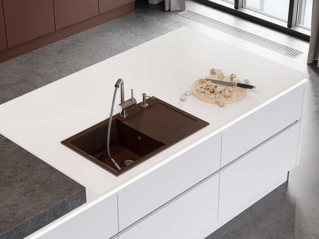 вровень со столешницей — создается ощущение бесшовного пространства, а если мойка сделана из того же материала, то и единого дизайна;