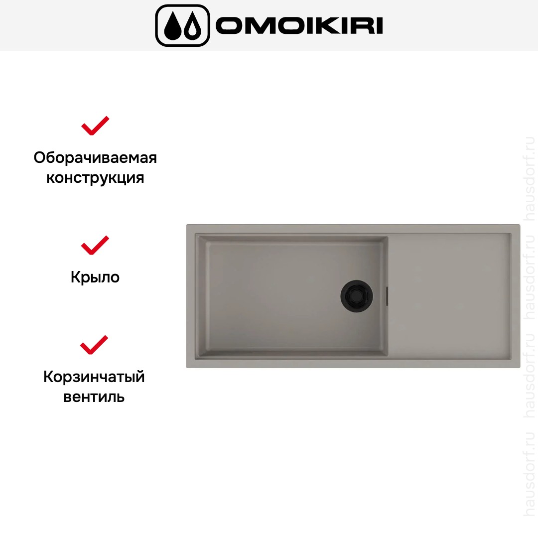 Обратите внимание на дизайнерские отличия мойки Омойкири, которые помогут в создании идеальной кухни в вашем доме. Она выполнена в цвете Серый Ленинград. Крыло, расположенное является дополнительным рабочим пространством, на котором можно сушить посуду, разделывать мясо и нарезать овощи.