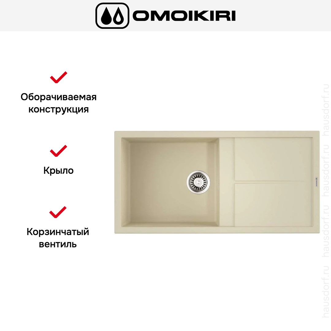 Мойка Omoikiri Sumi 100. Элегантный прямоугольный дизайн выполнен в мягком ванильном тоне и подойдет к разным стилям кухни. Плавные линии и строгий профиль создают аккуратный вид без лишних деталей. Поверхность выглядит монолитно и визуально расширяет рабочую зону за счет светлого оттенка.