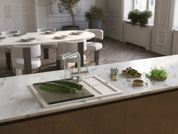 вровень со столешницей — создается ощущение бесшовного пространства, а если мойка сделана из того же материала, то и единого дизайна;