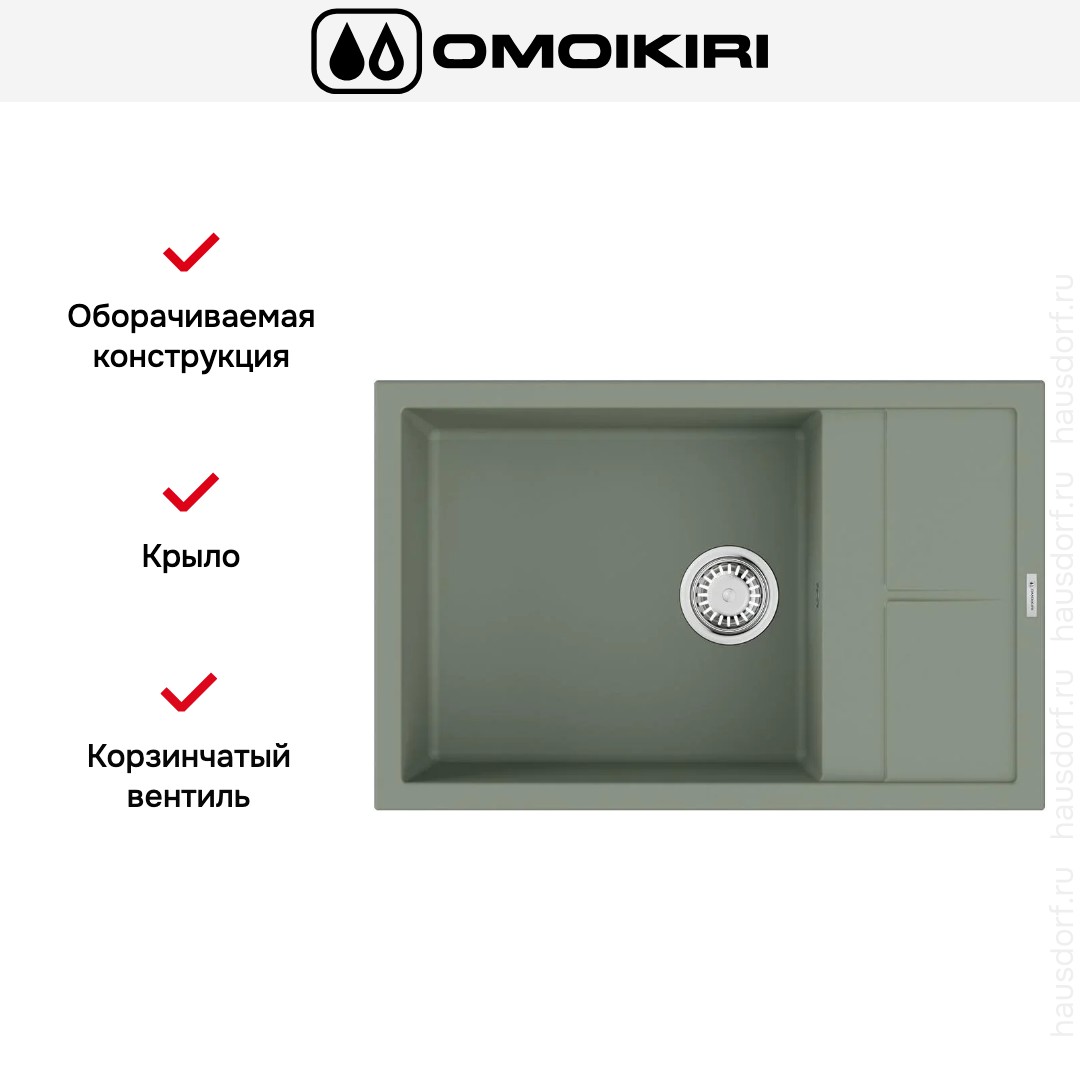 Прямоугольная конструкция сдержанного, но не заурядного серо-зеленого цвета имеет умеренные габариты 78×50 см и может устанавливаться в кухне любого размера. Компоновка сочетает основную чашу и функциональное крыло, образуя эргономичное рабочее пространство: сама мойка занимает 78 см в ширину и 50 см в глубину, при этом чаша заметно глубже по вертикали — 20 см. Плоскости и переходы продуманы так, чтобы изделие гармонично смотрелось на столешнице и не привлекало лишнего внимания, оставаясь при этом стильным элементом интерьера.