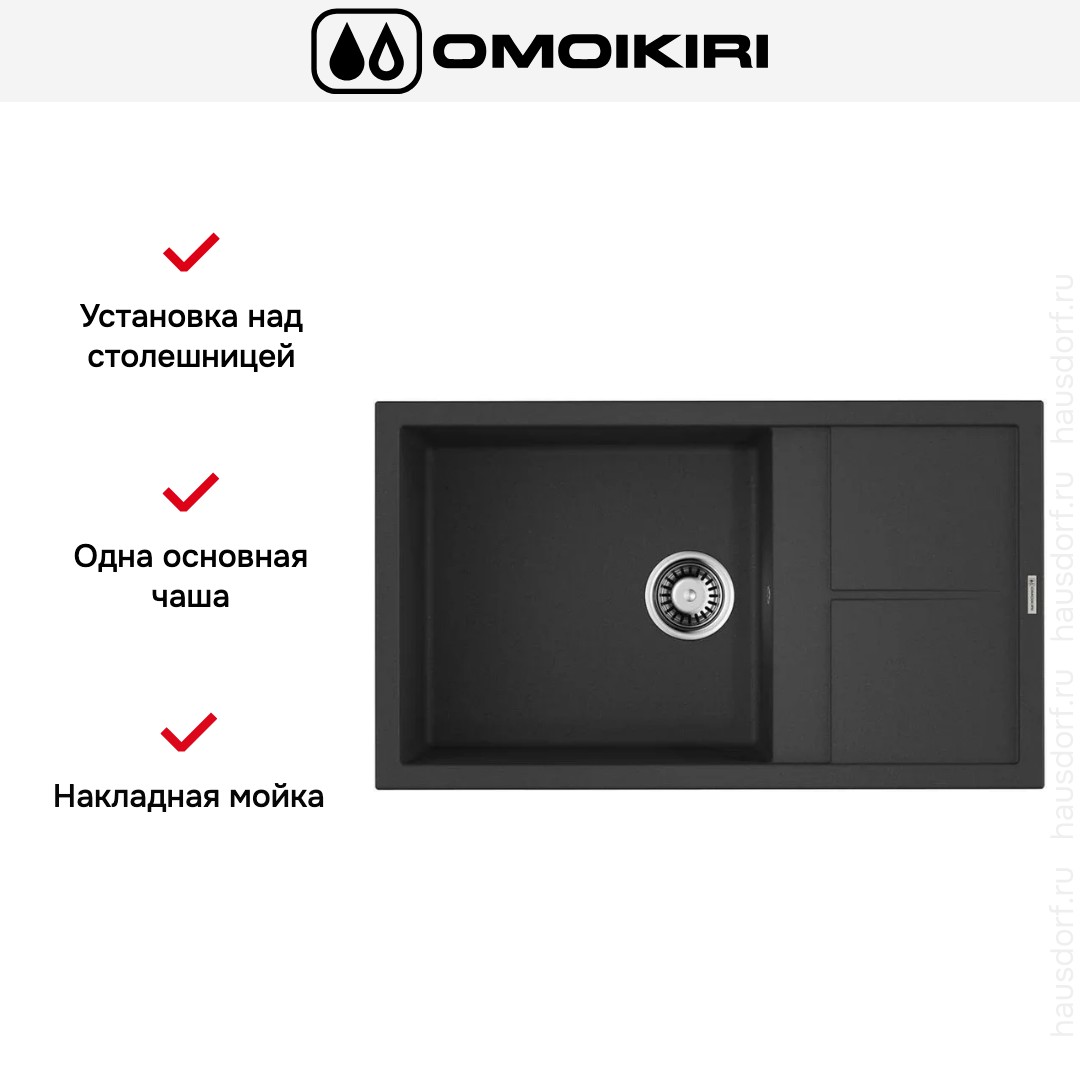 Мойка OMOIKIRI Sumi 86 BL — накладная прямоугольная модель с габаритами 86×50 см, созданная для тех, кто ценит практичность и стиль. Ее вытянутая форма обеспечивает удобную рабочую зону и вписывается в современные планировки. Черный цвет придает сдержанную элегантность и легко сочетается с разными столешницами.