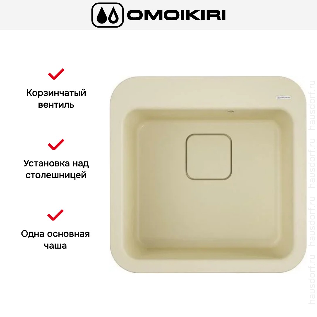 Мойка Omoikiri Tasogare 51 BE — накладная квадратная раковина 51×51 см в цвете ваниль, созданная для компактных кухонных зон и аккуратной интеграции над столешницей. Ее геометрия с ровными гранями и мягкими скруглениями отвечает современному минимализму и одновременно не перегружает пространство. Размеры чаши и внешние габариты делают изделие универсальным для типовых модулей шириной от 50 см и выше. Строгие пропорции и пастельный тон позволяют сочетать изделие с разными отделками и фурнитурой.