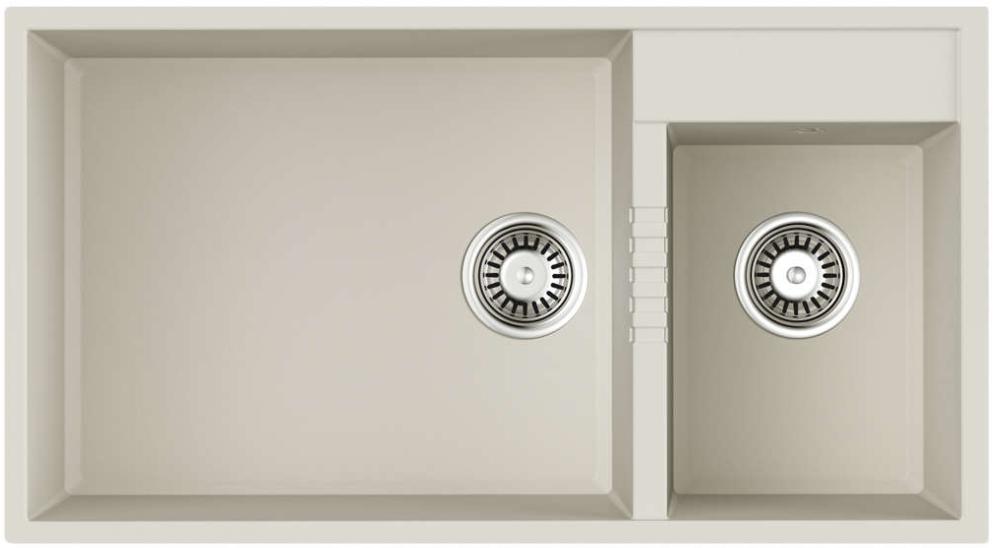 Габариты 85×46.5 см обеспечивают простор для работы и легко помещаются в модуль шириной от 90 см. Основная чаша размером 52.5×42.5 см и глубиной 21.5 см рассчитана на крупную посуду и кастрюли, она удобна для мытья и замачивания. Дополнительная чаша 25×34.5 см с глубиной 19 см отлично подходит для предварительной обработки продуктов и ополаскивания. Нереверсивная конструкция означает фиксированное расположение чаш, что важно учитывать при планировании расположения смесителя и распределения рабочего пространства.