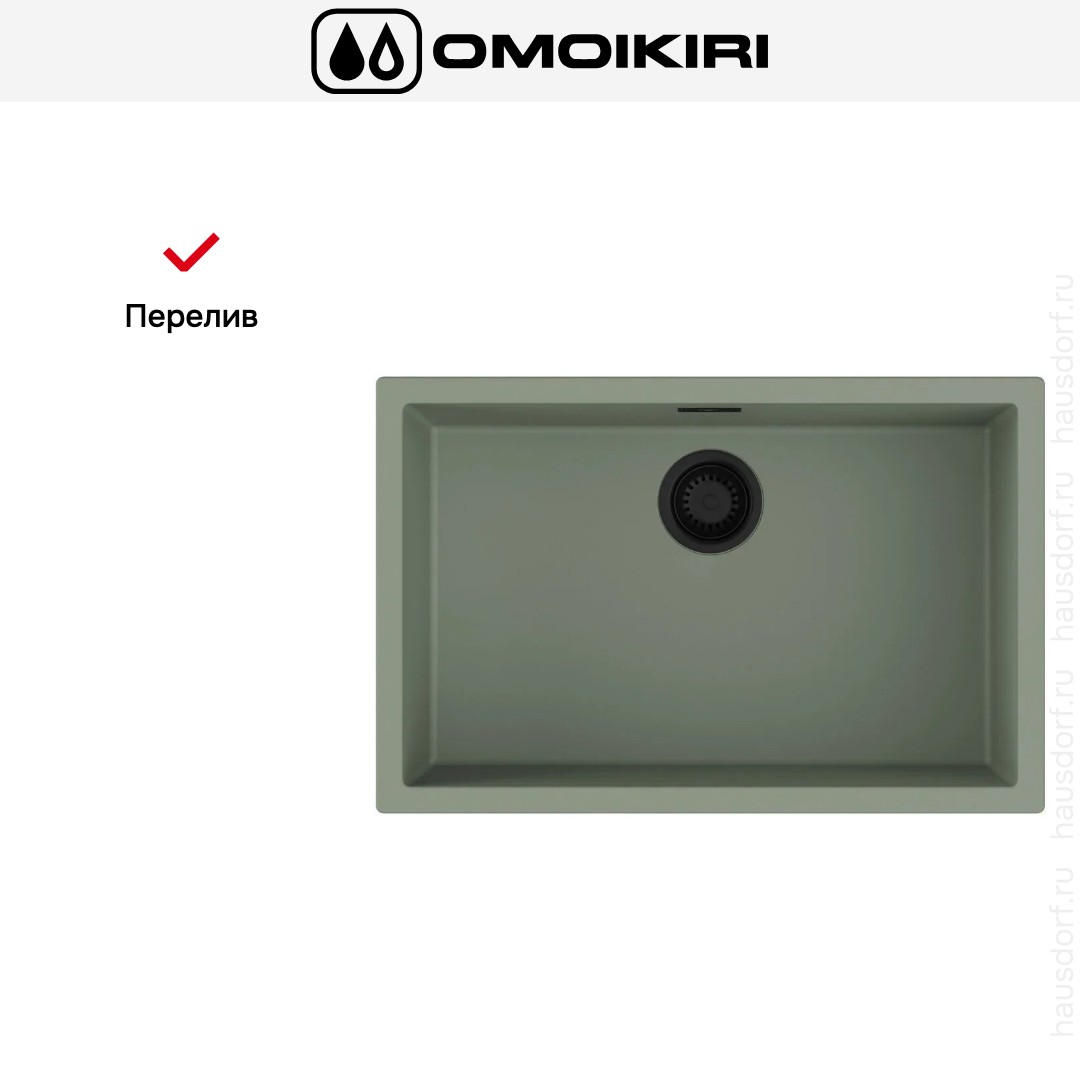 Модель выглядит лаконично и организованно: прямоугольная форма подчеркивает строгие линии, а поверхность серо-зеленого цвета добавляет спокойный акцент на кухне. Пропорции 75,6×45,6 см сбалансированы, поэтому рабочая зона кажется цельной. Единственная чаша отличается большими размерами — 70×40 см — и позволяет размещать крупные предметы. Перелив расположен так, чтобы сохранять рабочий ритм без лишних пауз на контроль уровня воды.