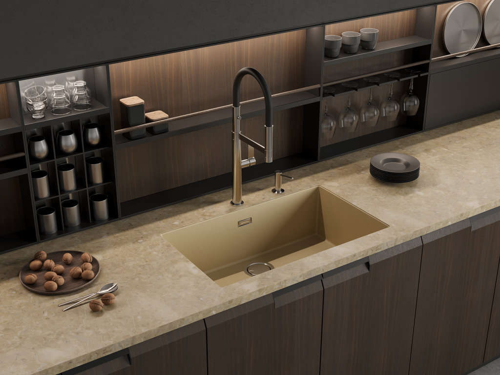 вровень со столешницей — создается ощущение бесшовного пространства, а если мойка сделана из того же материала, то и единого дизайна;