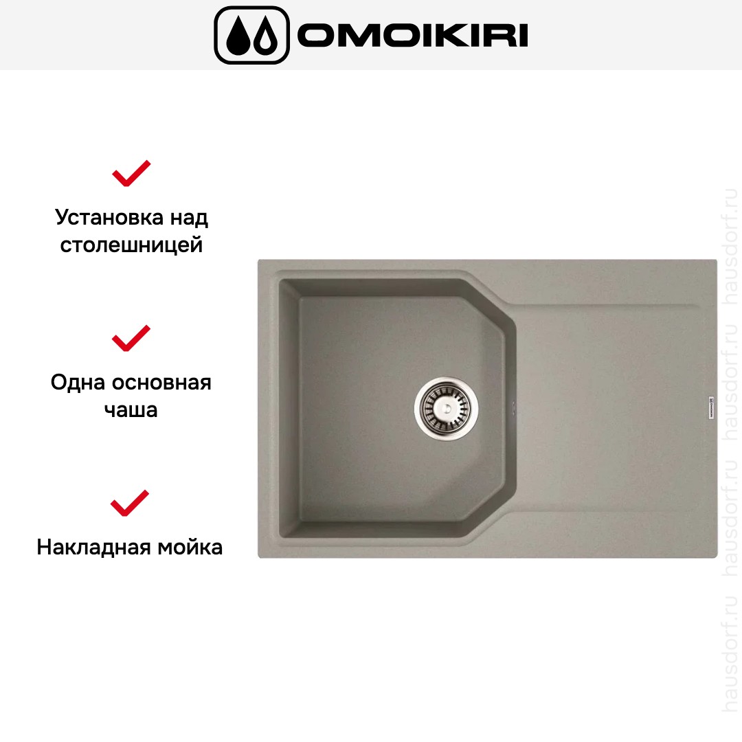 Накладная мойка Omoikiri — отличный выбор для тех, кто хочет создать гармоничное пространство с удобной сантехникой. простой в установке. Преимущество такой конструкции: легко подобрать практически к любой кухне и не придется демонтировать вместе с тумбой при ремонте или перестановке остальной мебели. Данная модель имеет стандартную форму, поэтому подходит большинству пользователей. Устанавливается над столешницей: это самый простой способ монтажа, зачастую с ним можно справиться даже без специалистов, главное — правильно рассчитать размеры ниши.
