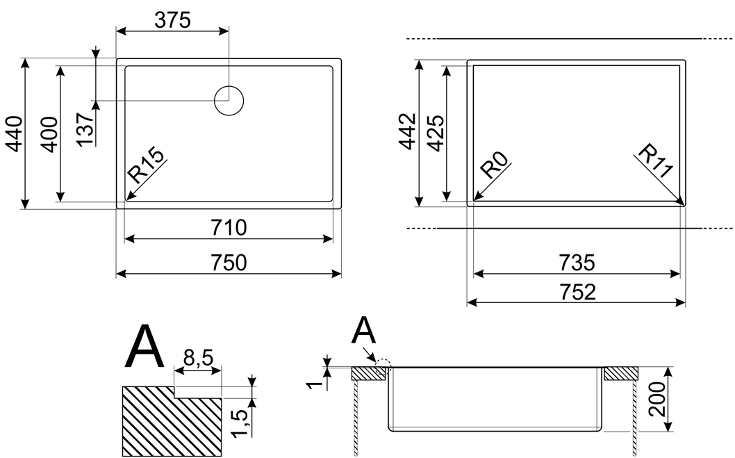 Врезной способ монтажа обеспечивает плавный переход от столешницы к краю мойки, что визуально делает конструкцию более цельной и упрощает уход за зоной стыка. Четкие, но слегка сглаженные линии подчеркивают лаконичность и универсальность дизайна, позволяя изделию гармонично вписываться в интерьеры различных стилей — от минимализма и лофта до современной классики.