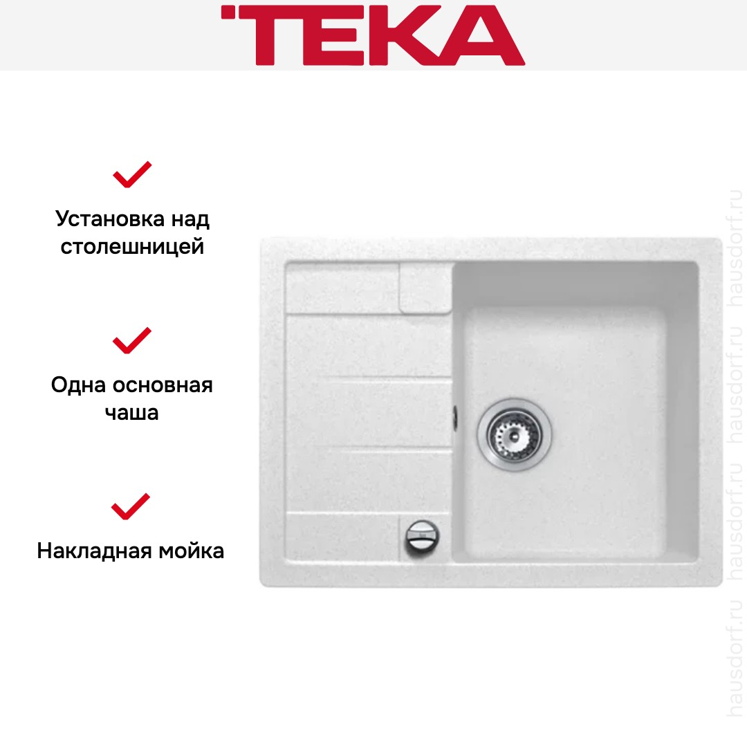 Мойка Teka Astral 45B TG White представляет собой элегантный накладной вариант для современной кухни. Ее прямоугольный силуэт задает сдержанный, но изящный стиль. Белый цвет добавляет света и визуально увеличивает пространство рабочей зоны. Матовая поверхность и аккуратные линии подчеркивают минимализм и легко вписываются в разные интерьерные решения.