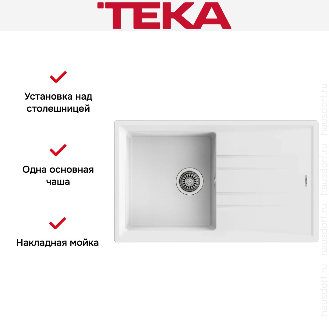 Накладная мойка Teka — отличный выбор для тех, кто хочет создать гармоничное пространство с удобной сантехникой. простой в установке. Преимущество такой конструкции: легко подобрать практически к любой кухне и не придется демонтировать вместе с тумбой при ремонте или перестановке остальной мебели. Данная модель имеет стандартную форму, поэтому подходит большинству пользователей. Устанавливается над столешницей: это самый простой способ монтажа, зачастую с ним можно справиться даже без специалистов, главное — правильно рассчитать размеры ниши.