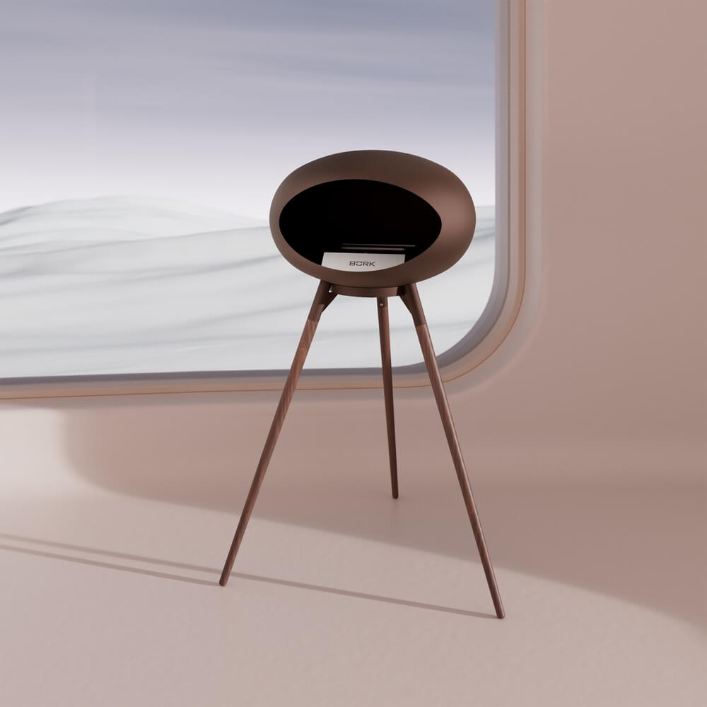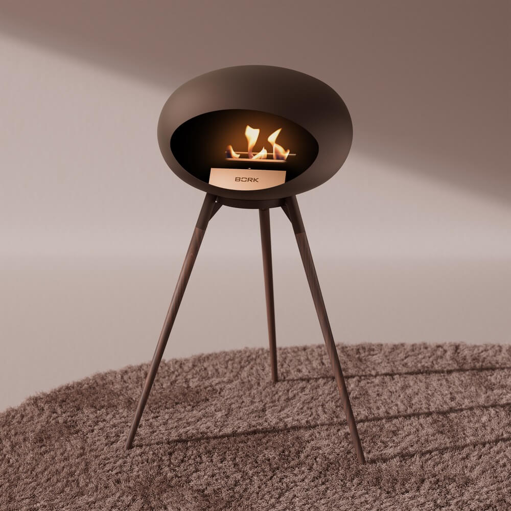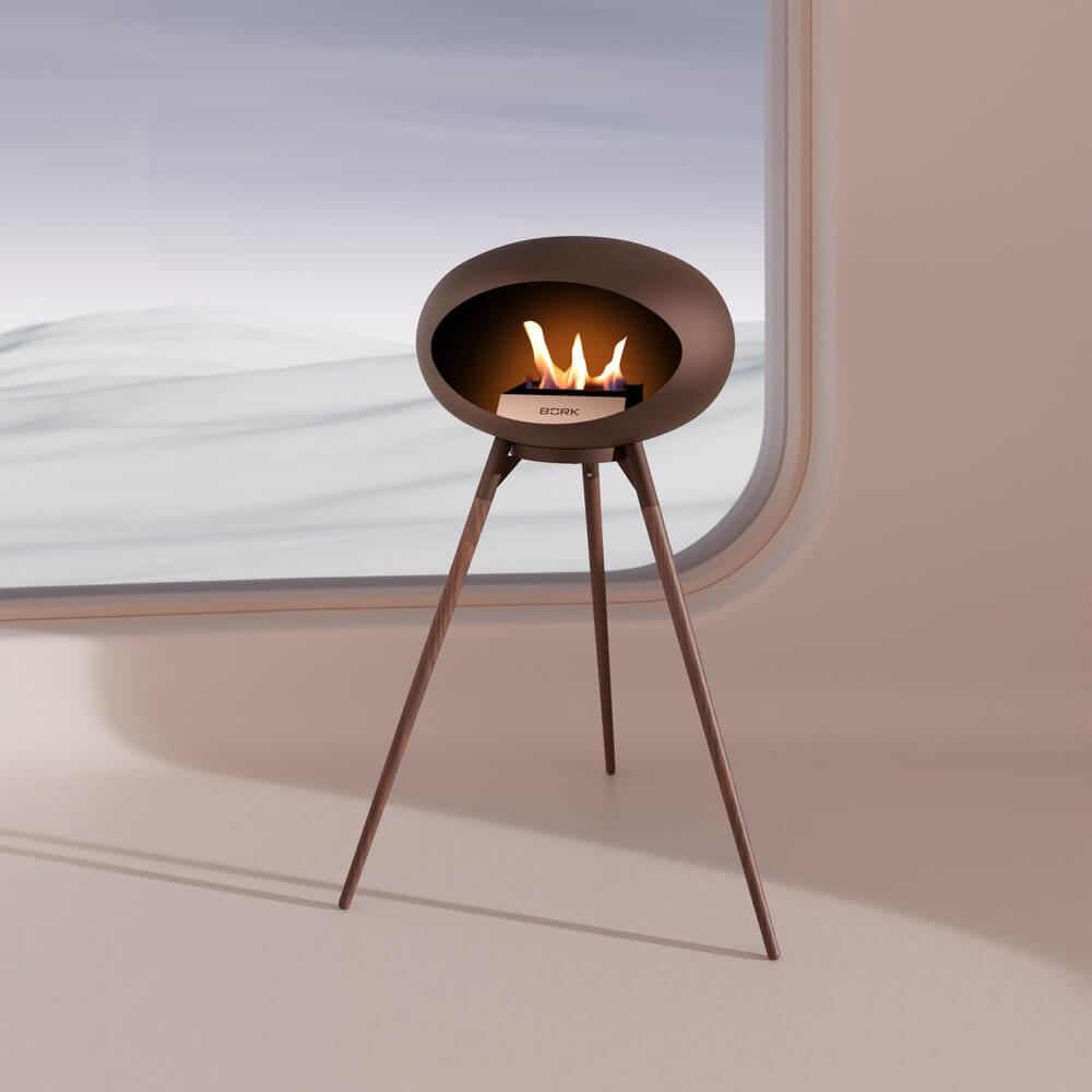Вневременной дизайн биокамина позволяет встроить его в любой интерьер. Чаша выполнена из стали, ножки — из американского ореха. Изысканный цвет камина эффектно подчеркивается сиянием пламени, что создает дополнительный уют в вашем доме.