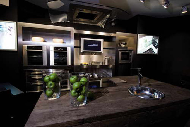 Передняя панель изготовлена из черного стекла с алюминиевыми профилями и рамкой из нержавеющей стали, что соответствует самым модным тенденциям в оформлении кухонного интерьера.