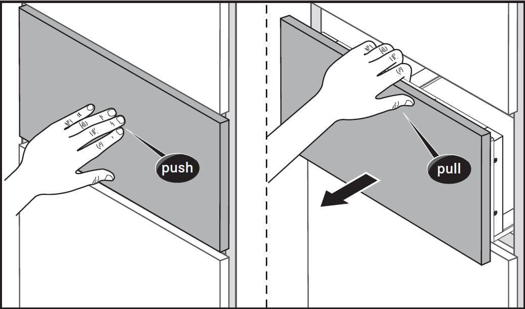 Открытие Push применяется в современных встраиваемых подогревателях посуды таких известных марок, как Smeg, Fulgor Milano, Kuppersbusch и ряда других премиальных брендов. Этот удобный способ позволяет конструировать встроенную технику без ручек, что позволяет легко открывать камеру, если руки заняты — например, нажимая на нее локтем. Такие фасады можно устанавливать встык в так называемом бесшовном дизайне, особенно при установке в колонну. В целях безопасности и для защиты механизма ящик при нажатии только приоткрывается, а затем его можно выдвинуть полностью, потянув на себя.