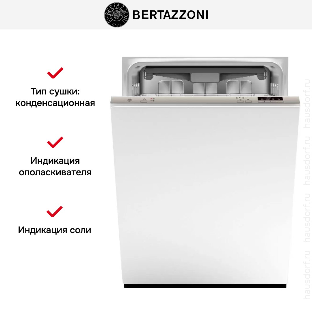 Посудомоечная машина Bertazzoni полностью встраивается в нишу кухонного гарнитура — она уже подготовлена к навеске мебельного фасада, остается только закрепить его. Обратите внимание: декоративные панели не входят в комплект. При проектировании кухни важно соблюдать требования производителя, указанные в инструкции: вес мебельного фасада не должен превышать допустимый, чтобы не деформировать технику.