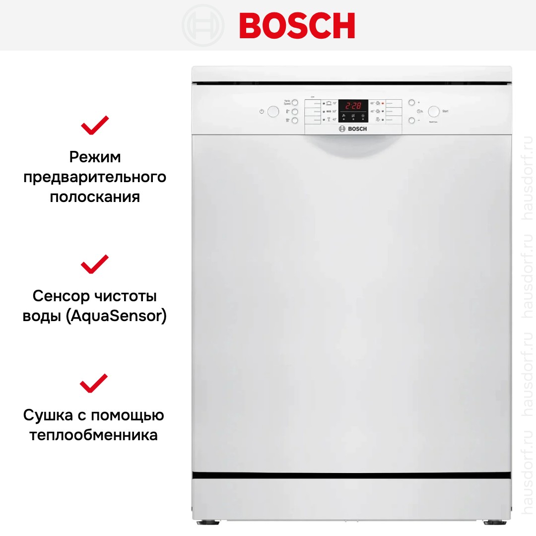 Посудомоечная машина Bosch SMS26DW00T — практичная и вместительная модель. Это полноразмерная отдельностоящая техника шириной 60 см. Габариты 84.5×60×60 см легко впишутся в стандартную нишу на кухне. Белый корпус и панель управления поддержат светлую гамму интерьера. Электронное управление с цифровым дисплеем упрощает доступ к регулировке параметров. Вместимость 13 комплектов подходит и на каждый день, и на праздники. Уровень шума 48 дБ позволяет запускать технику даже ночью без дискомфорта.