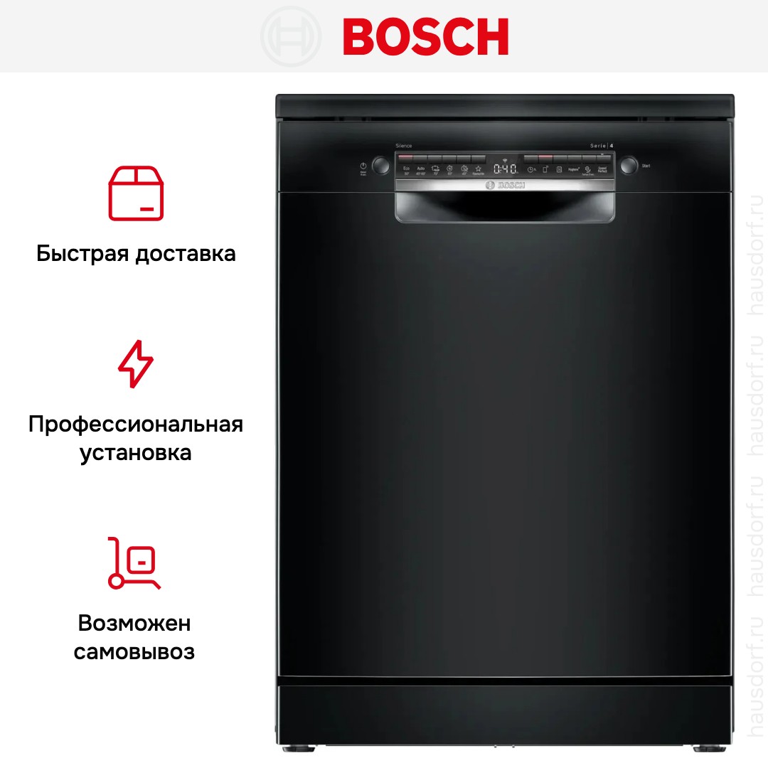 Посудомоечная машина Bosch SMS4IMB62Q выполнена в строгом черном цвете и предназначена для автономной установки. Ее полноразмерный корпус 84.5×60×60 см дает вместимость на 13 комплектов посуды, что делает устройство удачным выбором для семьи из 3-5 человек. Открытая панель управления в тон корпуса и цифровой дисплей создают лаконичный функциональный дизайн, а черная отделка панели снижает видимость отпечатков и следов воды.