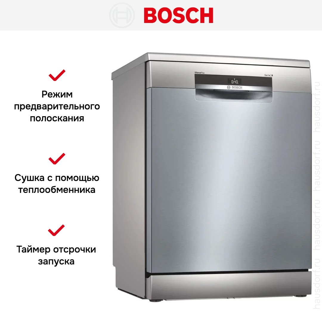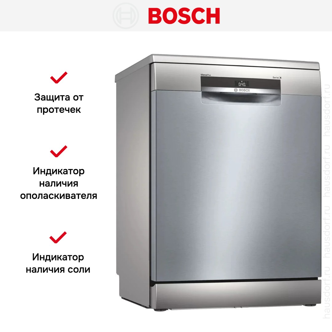 Отдельностоящая модель Бош отлично впишется в кухонный интерьер, главное — правильно выбрать место, чтобы подвести коммуникации. Имеет стандартные размеры, поэтому может не поместиться на очень маленькой кухне. В камеру можно загрузить ограниченное число комплектов: 13 шт. Комплектом считается набор посуды на одного человека, который нужен для полноценного приема пищи: глубокая и плоская тарелки, тарелка для салата, блюдце под чашку, сама чашка, ложка и вилка.