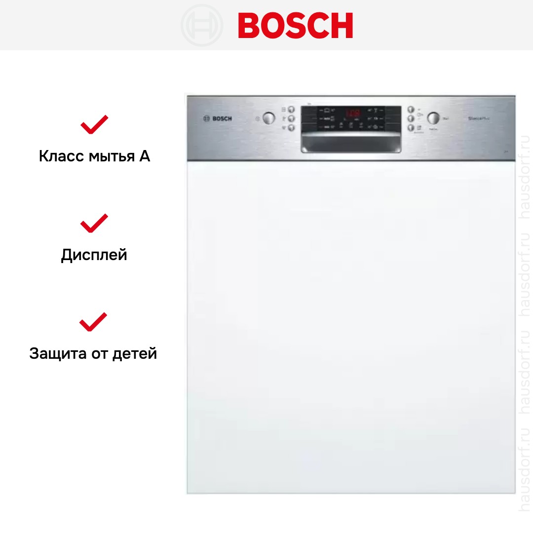 Посудомоечная машина Bosch SMI46KS00T — встроенный полноразмерный агрегат с открытой панелью и строгим стальным фасадом, который легко впишется в интерьер современной кухни. Корпус и лицевая часть из нержавеющей стали придают изделию деловой вид и облегчают уход за внешней поверхностью. Высота и стандартная ширина делают модель совместимой с типовой кухонной нишей, а регулируемые ножки упрощают точную установку по уровню.