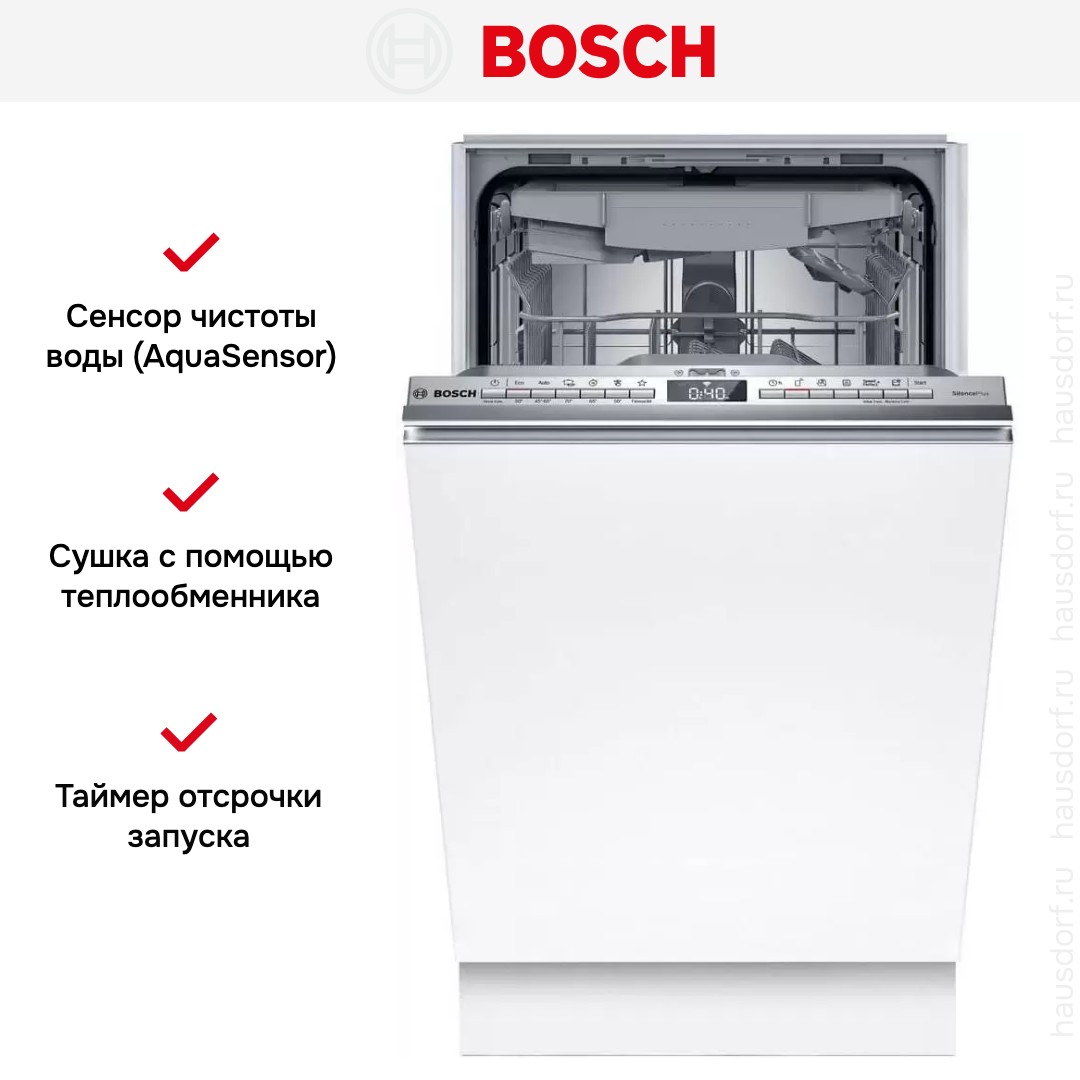 Компактная конструкция рассчитана на 10 комплектов посуды и три корзины, включая отдельную полку для столовых приборов. Такое решение облегчает распределение тарелок, бокалов и кастрюль, а наличие трёх уровней загрузки дает больше свободы при расстановке посуды разных размеров. Пять уровней распределения воды и внутренняя камера из нержавеющей стали обеспечивают равномерное и бережное мытьё, а материал бака повышает долговечность и снижает риск неприятных запахов. Регулируемые ножки упрощают установку в неровном проёме, а размеры ниши 81.5—87.5×45×55 см учитывают погрешности при монтаже.