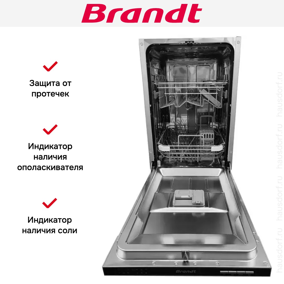 Посудомоечная машина Brandt VS1010J — это высокое качество и идеальные результаты работы. Устройство представлено в размере шириной 45 сантиметров, что позволяет устанавливать ее даже в небольших по площади помещениях. Устройство оборудовано двумя корзинами, которые легко выдвигаются из камеры для загрузки и выгрузки. Верхнюю можно отрегулировать по высоте, что позволяет с комфортом разместить габаритные предметы, например, противни. Для продолжительной качественной работы предусмотрена индикация, которая оповещает пользователя о необходимости пополнить резервуары с солью и ополаскивателем. Посудомоечная машина Брандт VS1010J располагает разнообразными режимами, что позволяет подобрать идеальный вариант для текущей загрузки: от быстрой до интенсивной мойки. В комплектацию входит инструкция.