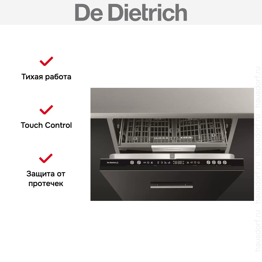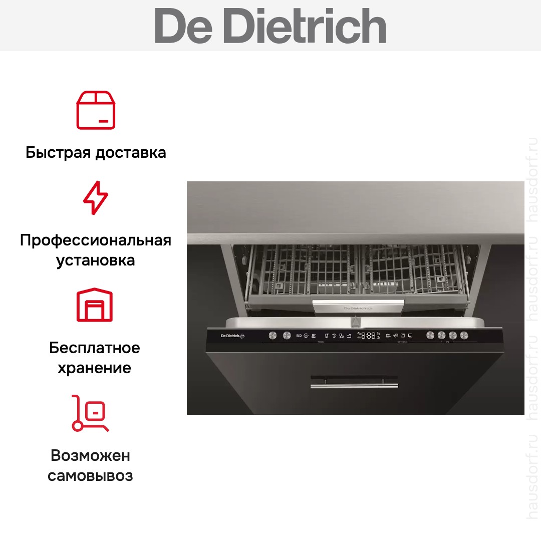 Встраиваемая модель Де Дитрих отлично впишется в любой интерьер, главное — правильно выбрать место, чтобы подвести коммуникации. Устанавливается в нишу целиком, полностью закрывается декоративной панелью. Обратите внимание: в комплекте не идет фасад, его необходимо установить самостоятельно. Имеет стандартные размеры, поэтому может не поместиться на очень маленькой кухне. В камеру можно загрузить ограниченное число комплектов: 14 шт. Комплектом считается набор посуды на одного человека, который нужен для полноценного приема пищи: глубокая и плоская тарелки, тарелка для салата, блюдце под чашку, сама чашка, ложка и вилка.