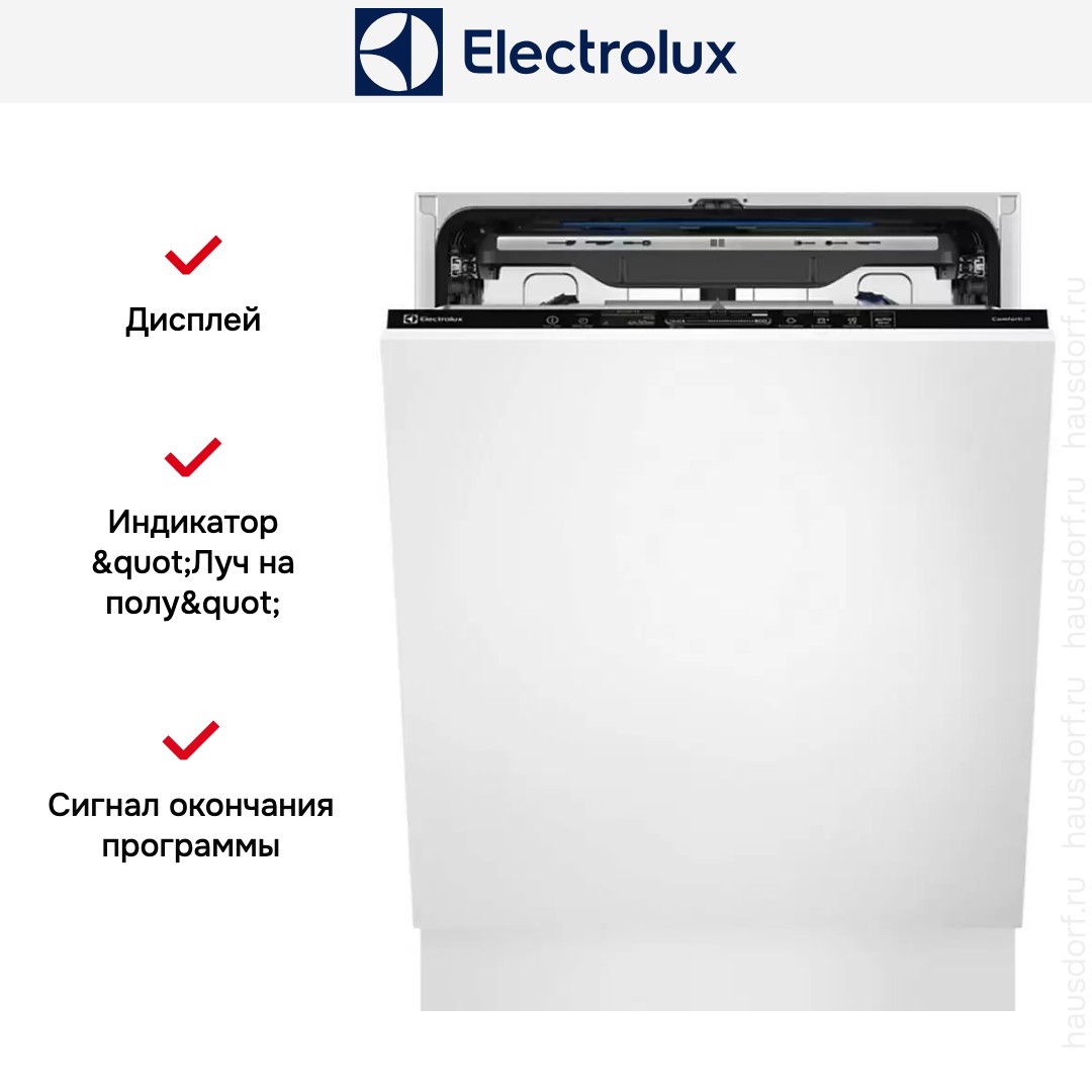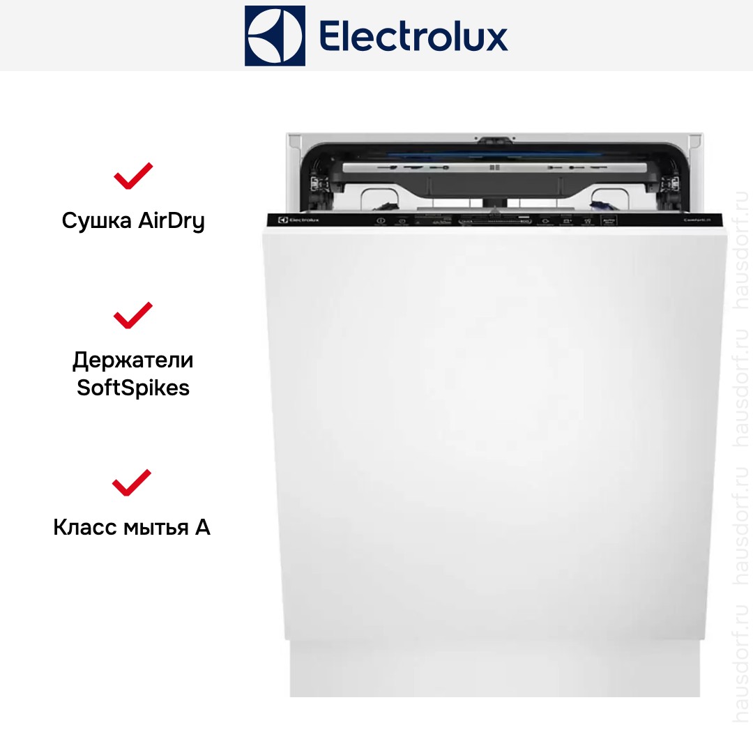 Встраиваемая модель Электролюкс отлично впишется в любой интерьер, главное — правильно выбрать место, чтобы подвести коммуникации. Устанавливается в нишу целиком, полностью закрывается декоративной панелью. Обратите внимание: в комплекте не идет фасад, его необходимо установить самостоятельно. Имеет стандартные размеры, поэтому может не поместиться на очень маленькой кухне. В камеру можно загрузить ограниченное число комплектов: 14 шт. Комплектом считается набор посуды на одного человека, который нужен для полноценного приема пищи: глубокая и плоская тарелки, тарелка для салата, блюдце под чашку, сама чашка, ложка и вилка.