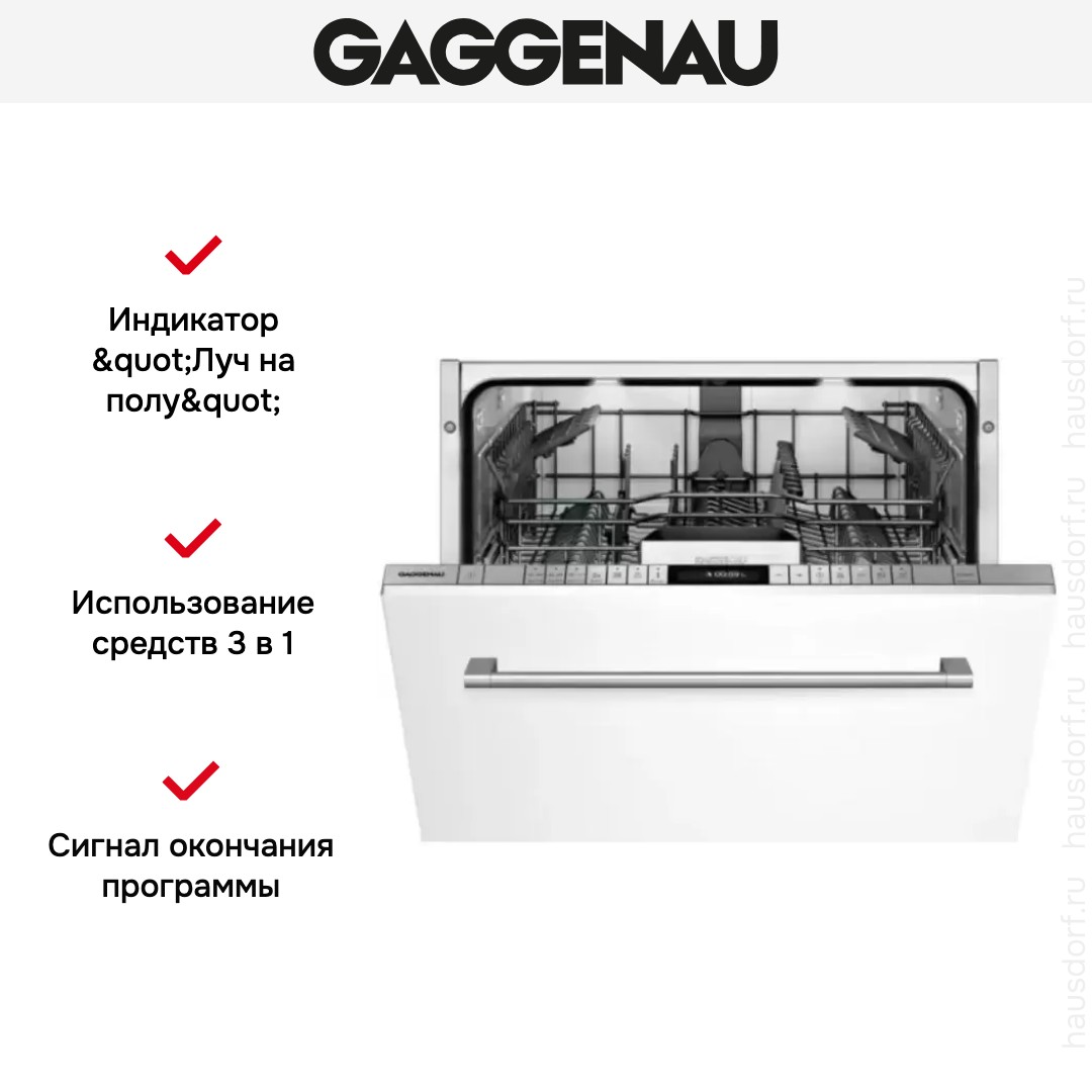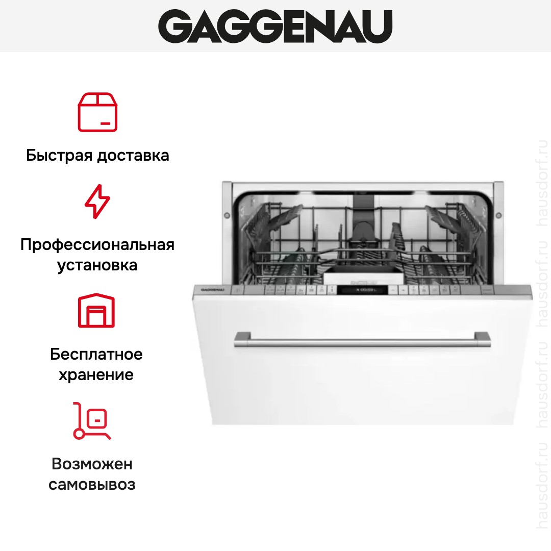 Встраиваемая модель Гаггенау отлично впишется в любой интерьер, главное — правильно выбрать место, чтобы подвести коммуникации. Устанавливается в нишу целиком, полностью закрывается декоративной панелью. Обратите внимание: в комплекте не идет фасад, его необходимо установить самостоятельно. Имеет стандартные размеры, поэтому может не поместиться на очень маленькой кухне. В камеру можно загрузить ограниченное число комплектов: 12 шт. Комплектом считается набор посуды на одного человека, который нужен для полноценного приема пищи: глубокая и плоская тарелки, тарелка для салата, блюдце под чашку, сама чашка, ложка и вилка.