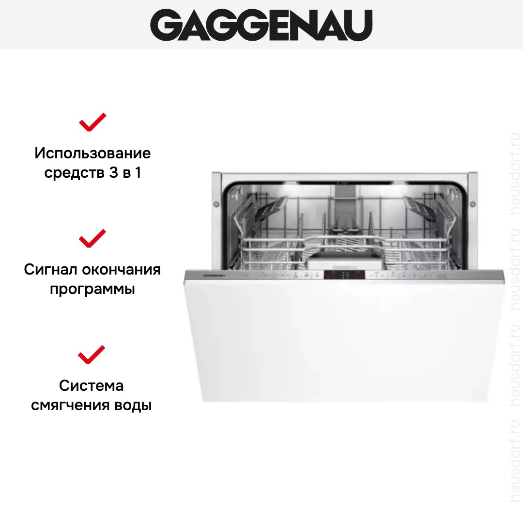 Встраиваемая модель Гаггенау отлично впишется в любой интерьер, главное — правильно выбрать место, чтобы подвести коммуникации. Устанавливается в нишу целиком, полностью закрывается декоративной панелью. Обратите внимание: в комплекте не идет фасад, его необходимо установить самостоятельно. Имеет стандартные размеры, поэтому может не поместиться на очень маленькой кухне. В камеру можно загрузить ограниченное число комплектов: 13 шт. Комплектом считается набор посуды на одного человека, который нужен для полноценного приема пищи: глубокая и плоская тарелки, тарелка для салата, блюдце под чашку, сама чашка, ложка и вилка.
